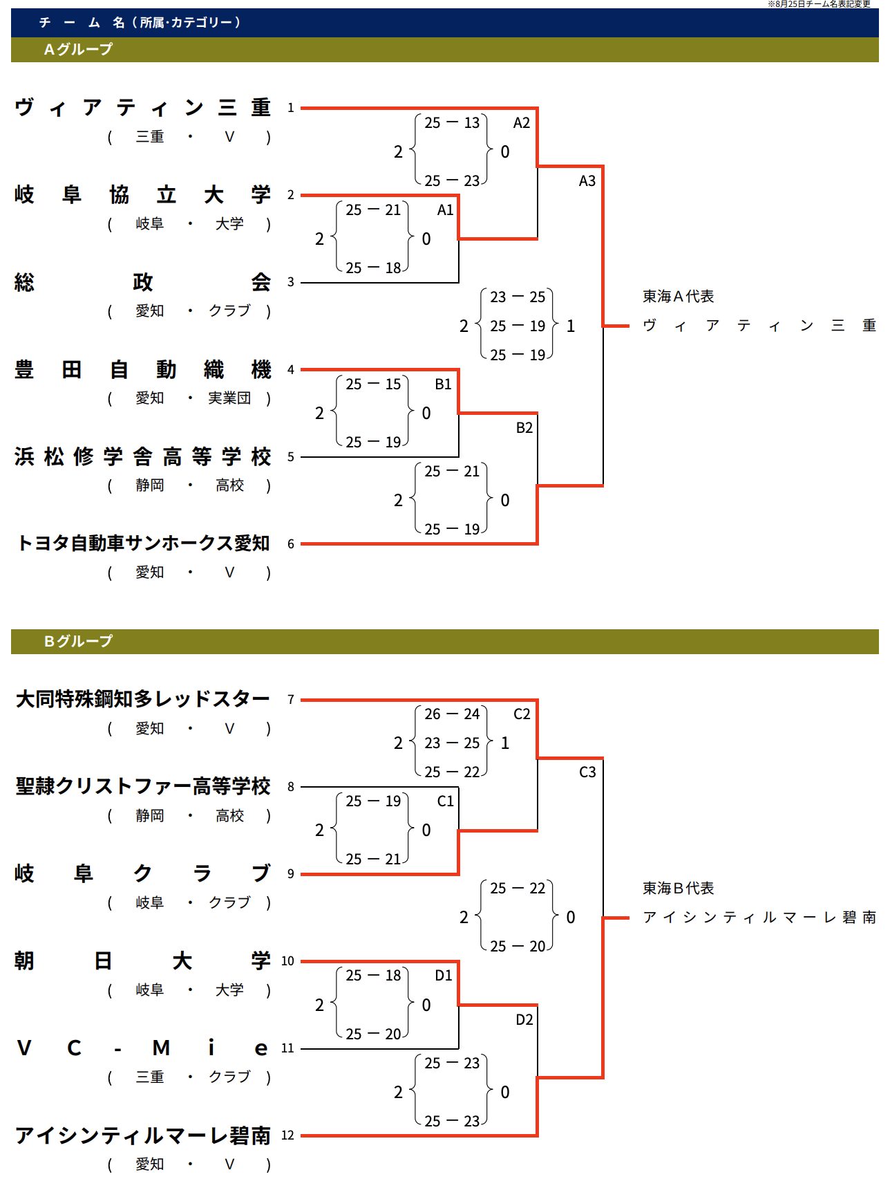 | 岐阜協立大学 (岐阜/大学) | 2 | 25-21 25-18 | 0 | 総政会 (愛知/クラブ) |