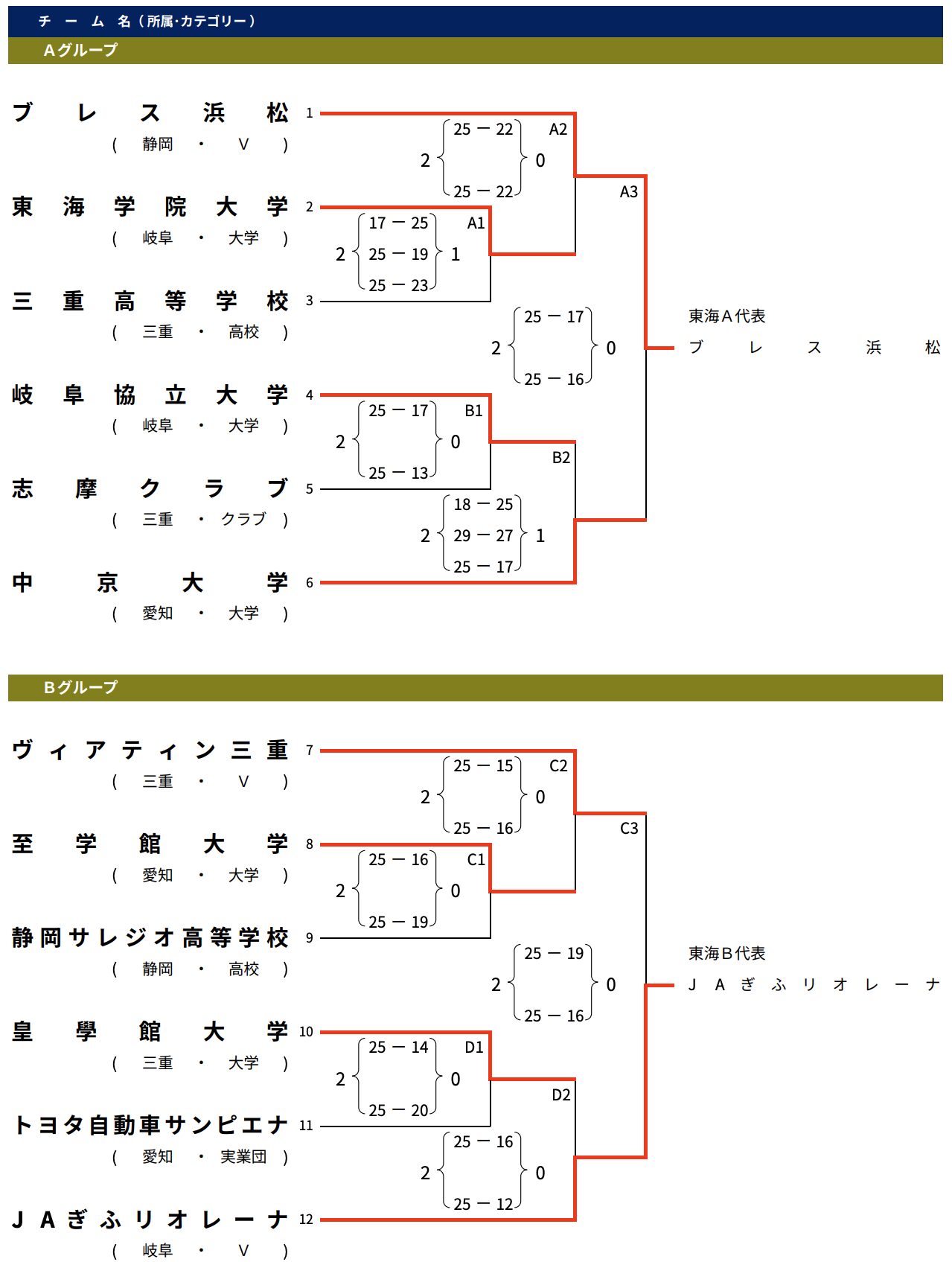 | ブレス浜松 (静岡/V) | 2 | 25-22 25-22 | 0 | 東海学院大学 (岐阜/大学) |