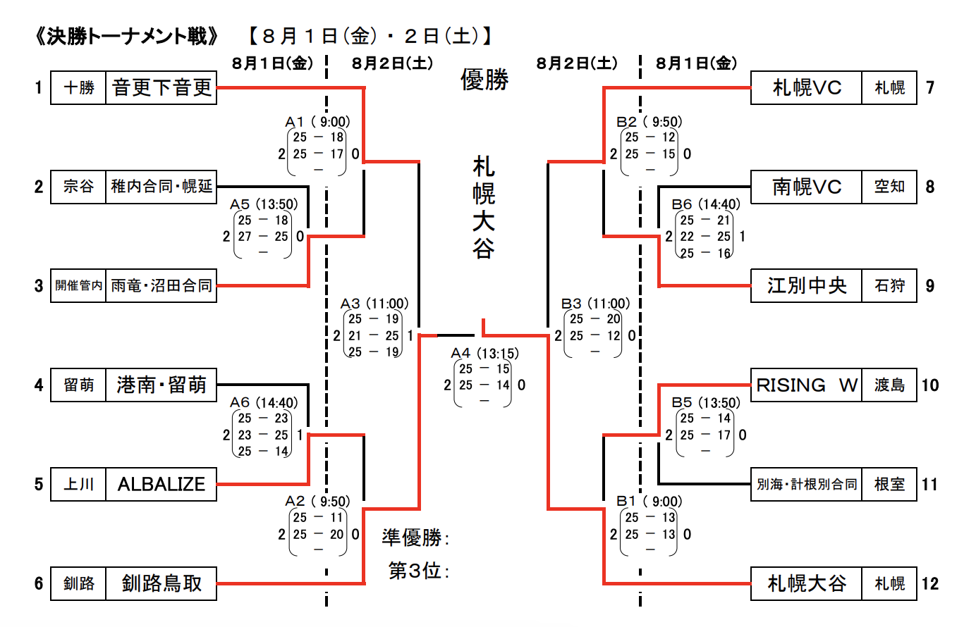| 札幌VC | 0 | 20-25 12-25 | 2 | 札幌大谷 |