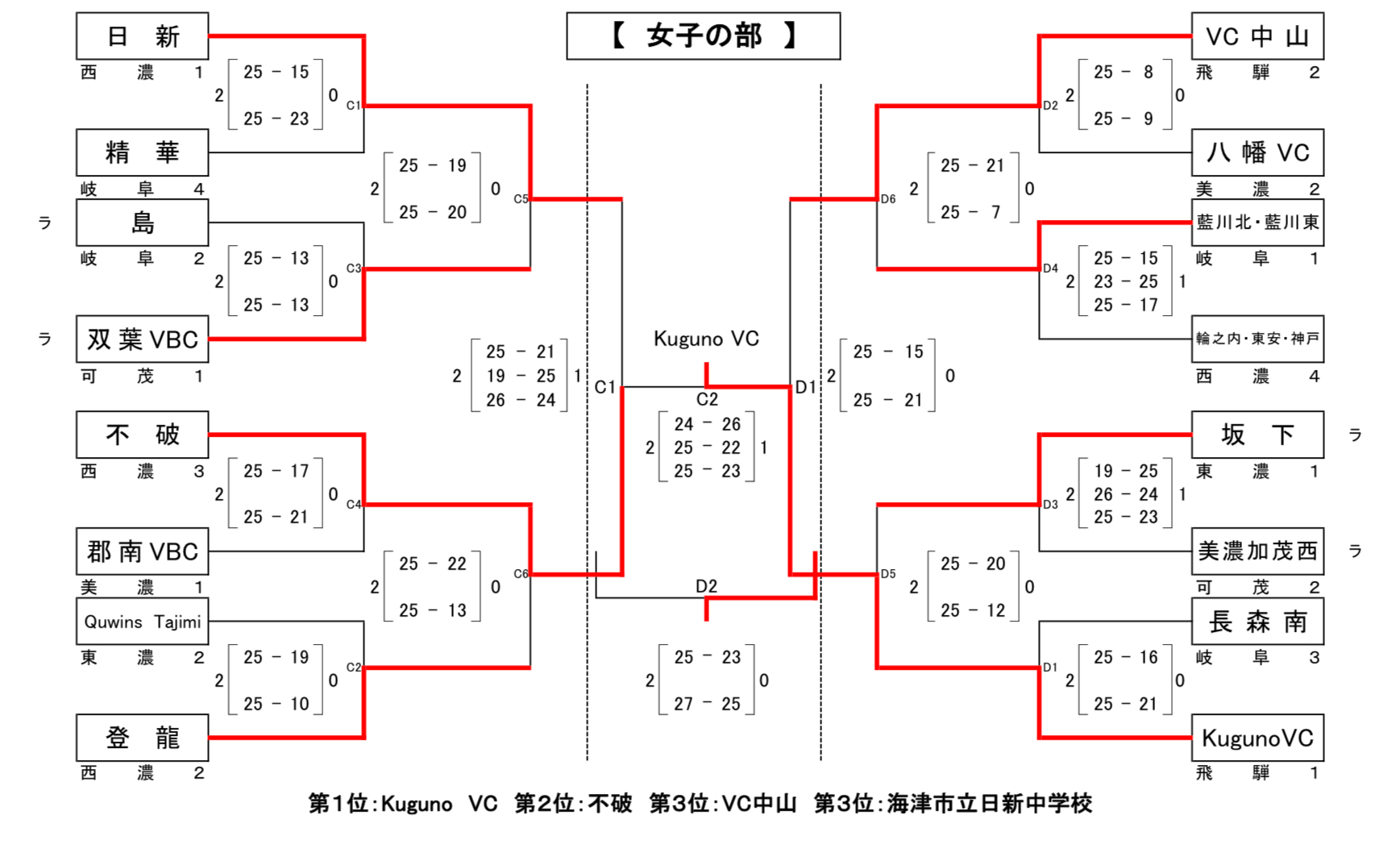 | 坂 下 | 2 | 19-25 26-24 25-23 | 0 | 美濃加茂西 |