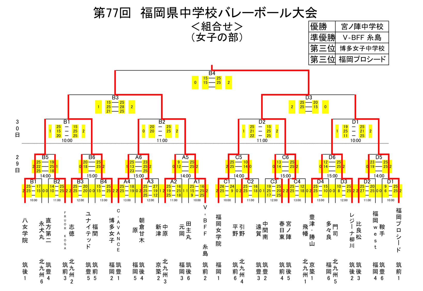 | 博多女子 | 1 | 15-25 26-28 21-25 | 2 | V・BFF糸島 |