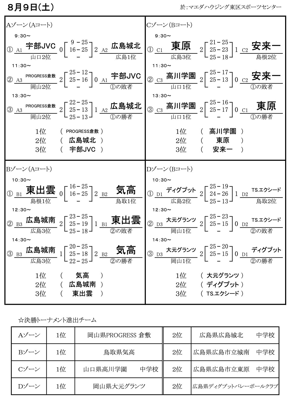 | PROGRESS倉敷 (岡山2位) | 2 | 25-14 25-16 | 0 | 広島城南 (広島3位) |