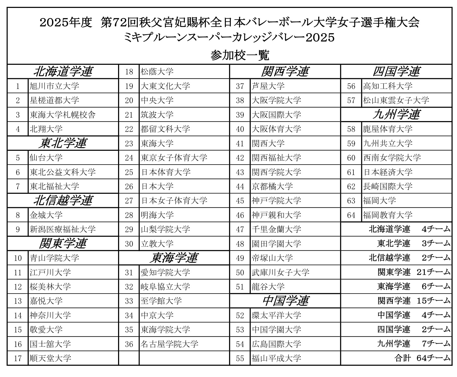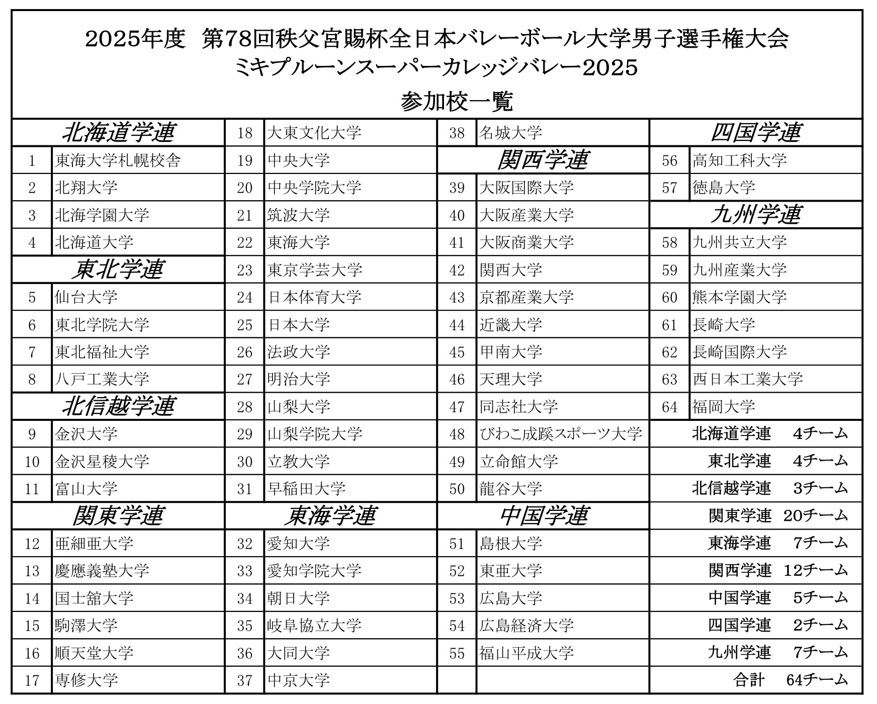 ミキプルーンスーパーカレッジバレー2025に参加できるのは、地区学連の割り当てられた数とする。なお下記の条件を満たしていること。