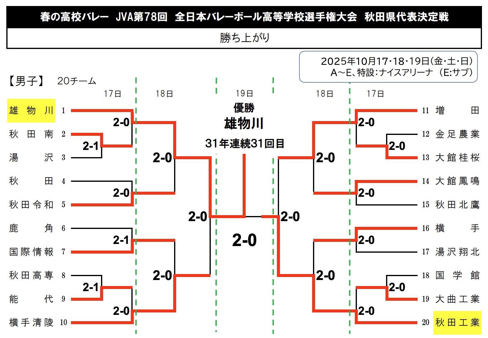 | 大館鳳鳴 | 2 | 25-20 25-23 | 0 | 秋田北鷹 |