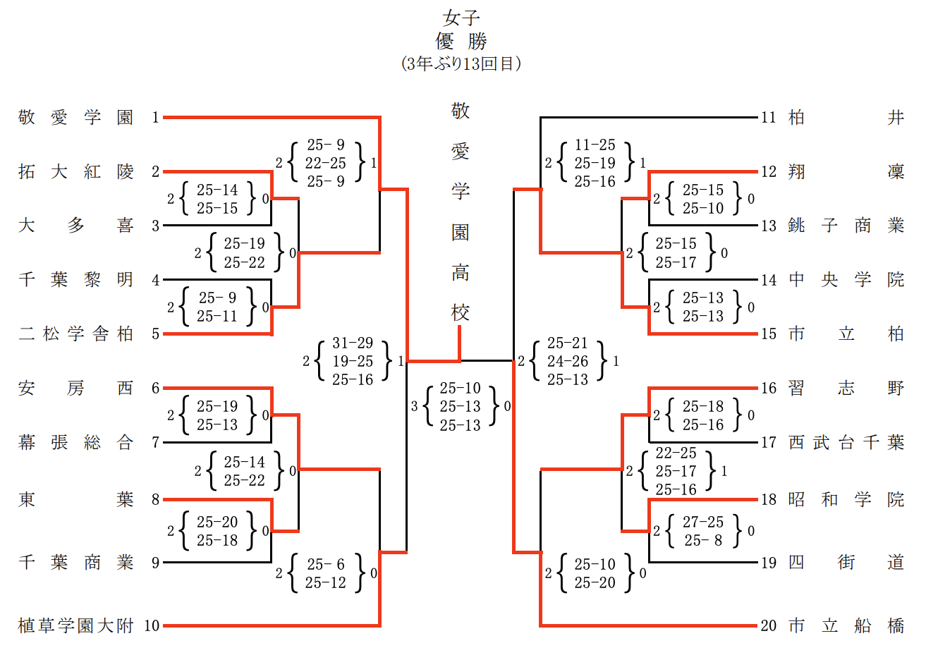 | 敬愛学園 | 2 | 25-9 22-25 25-9 | 1 | 二松学舎柏 |