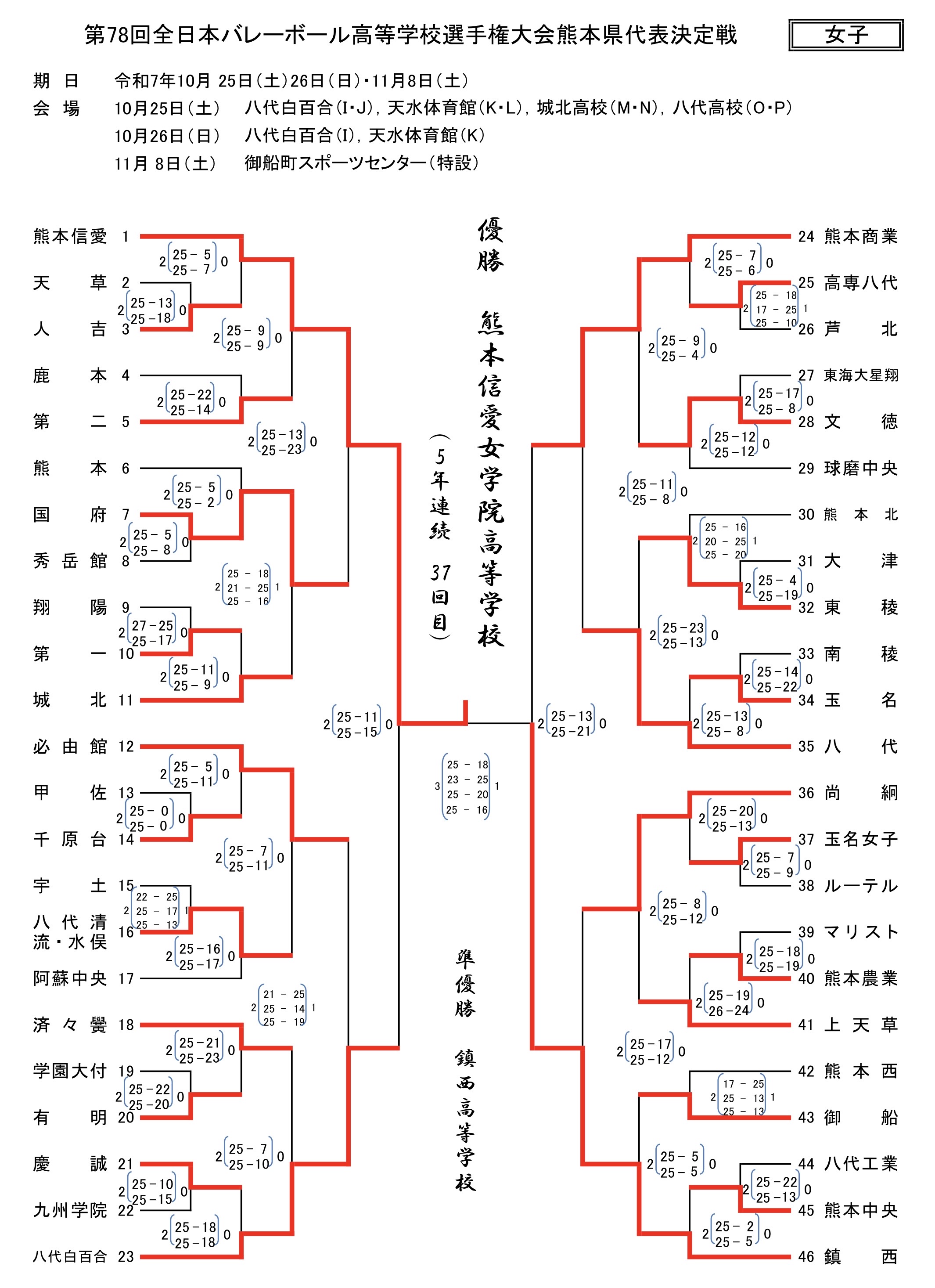 | 熊本商業 | 2 | 25-11 25-8 | 0 | 八 代 |