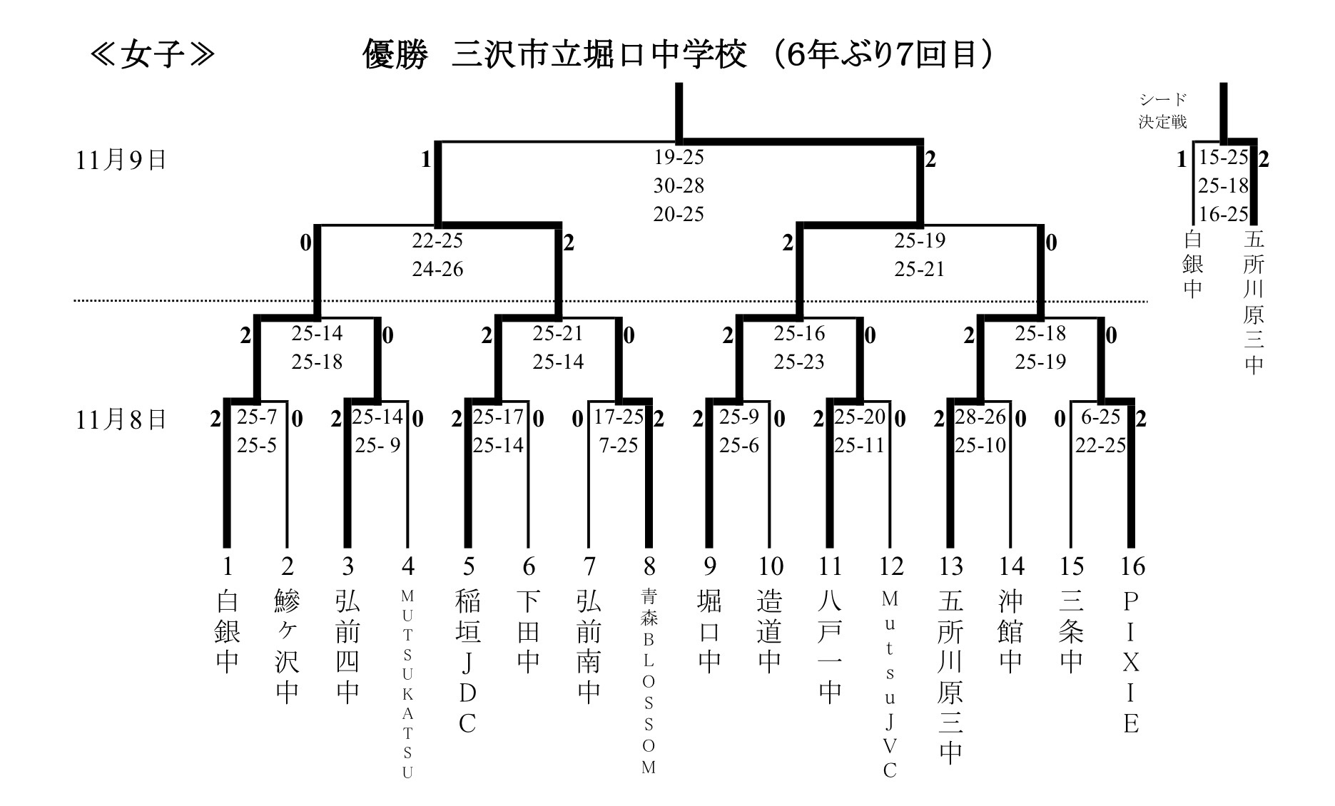 | 白 根 | 2 | 25-7 25-5 | 0 | 鰺ヶ沢 |