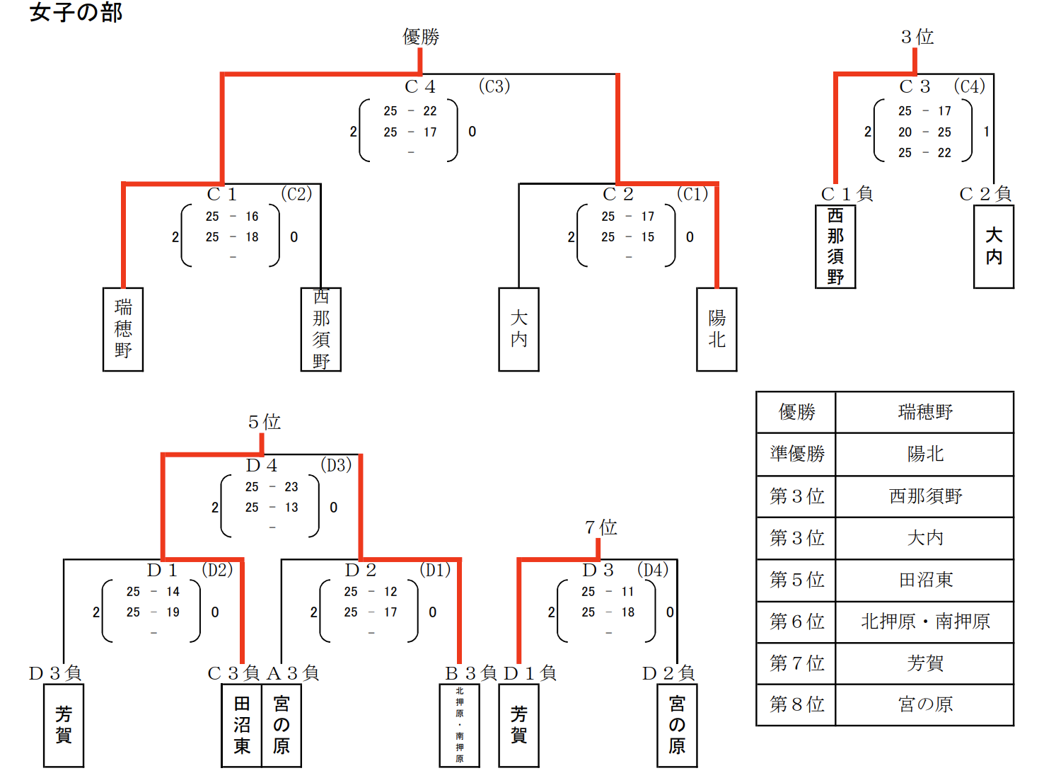 | 瑞穂野 | 2 | 25-16 25-18 | 0 | 西那須野 |