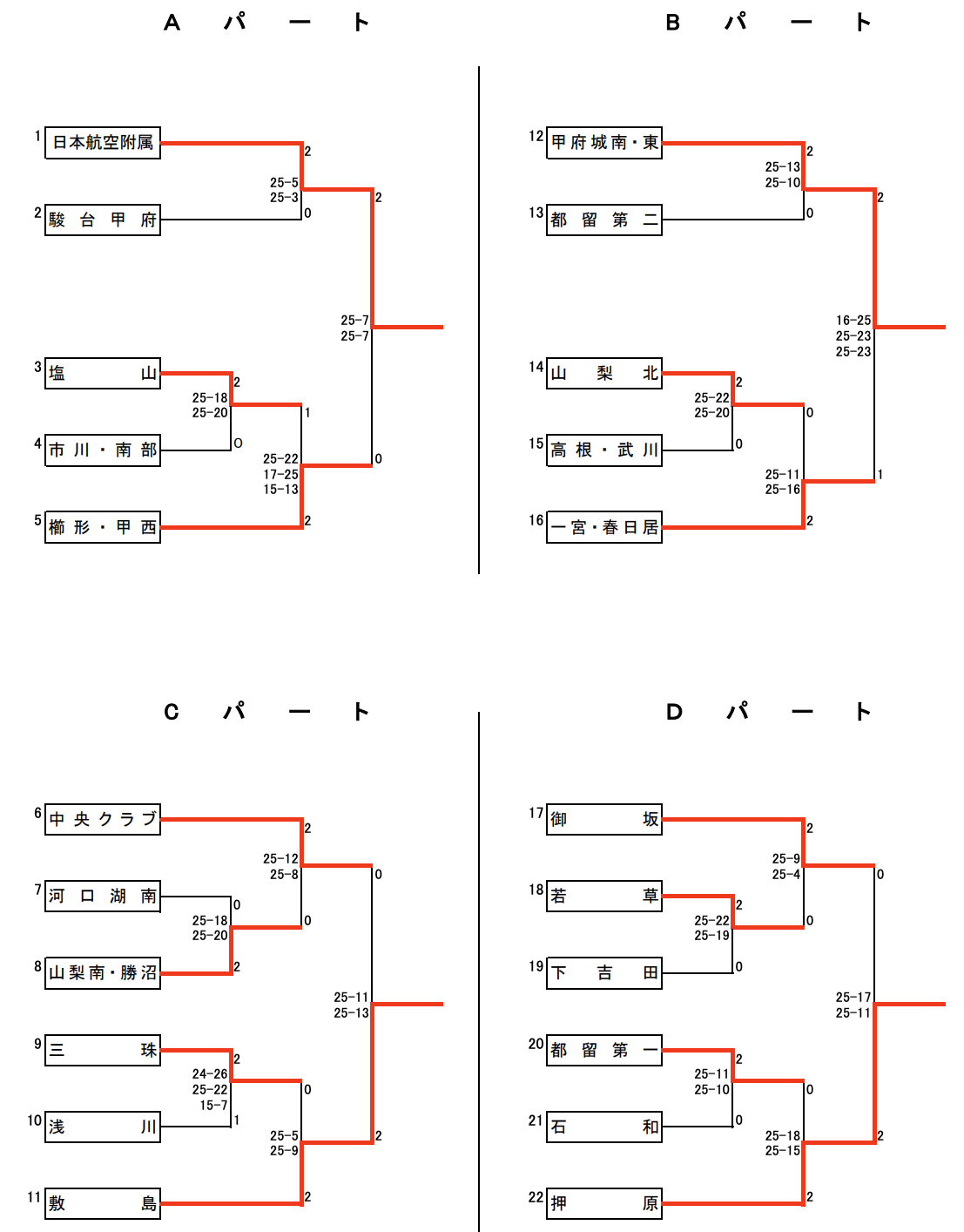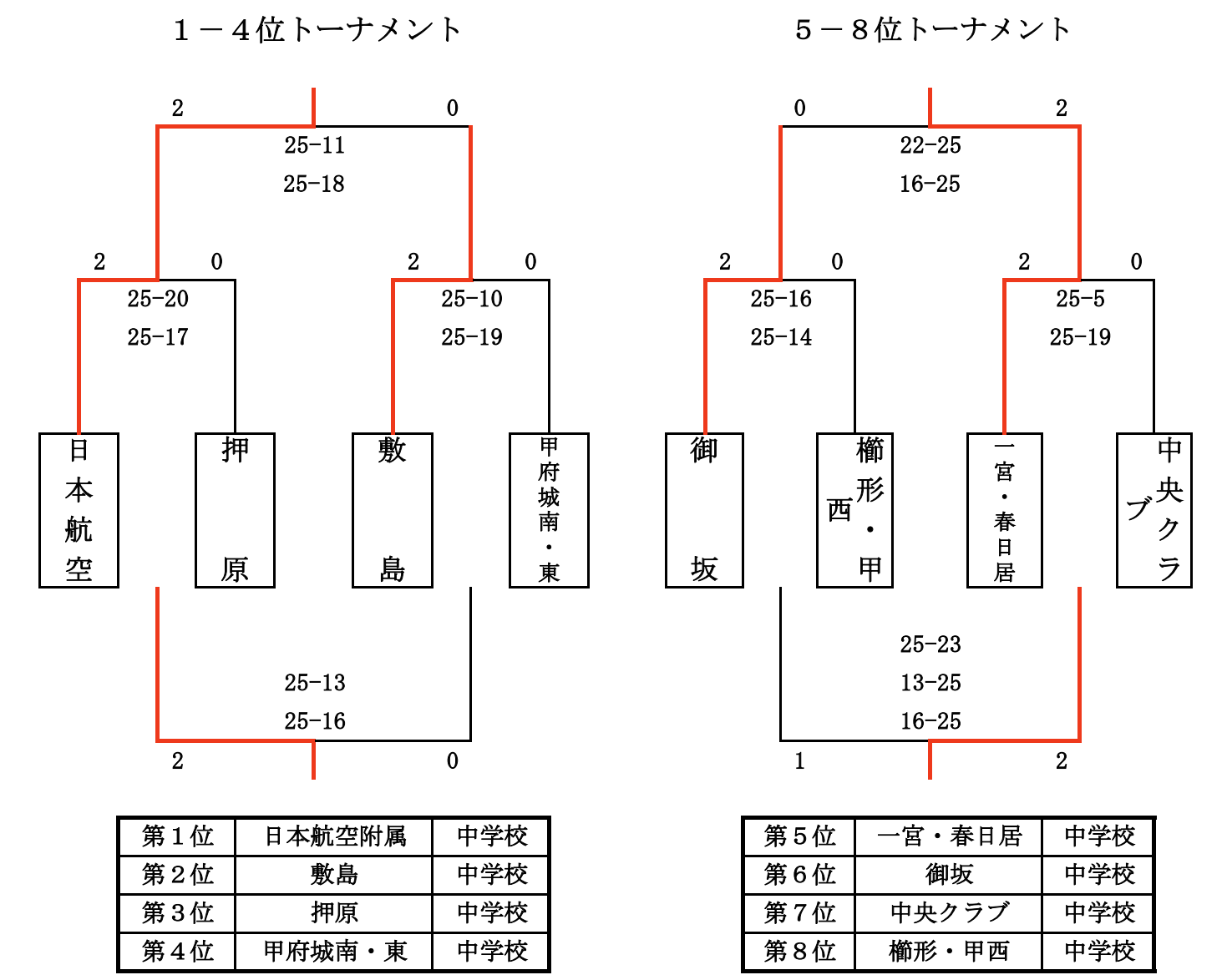 | 日本航空附属 | 2 | 25-5 25-3 | 0 | 駿台甲府 |