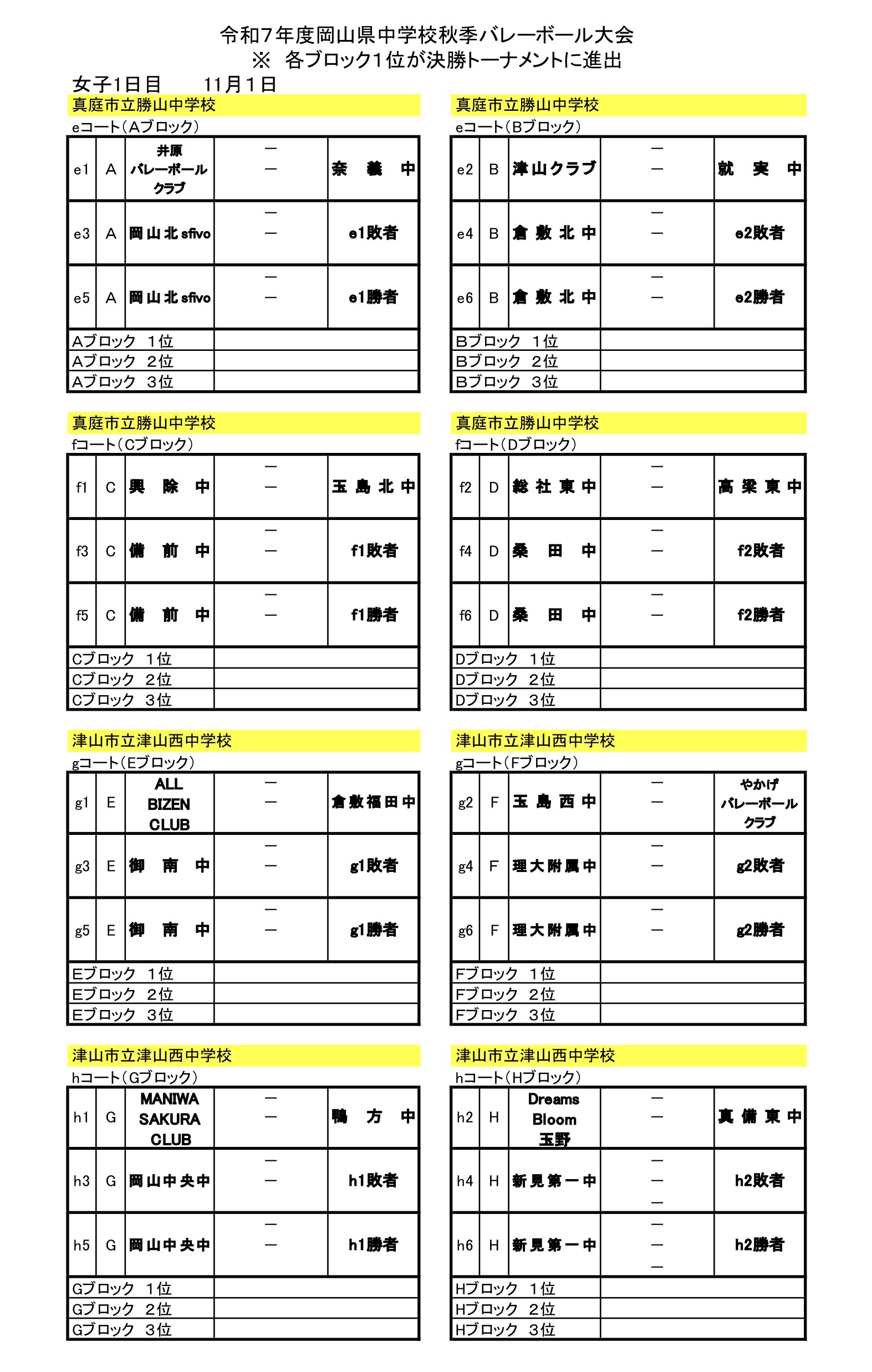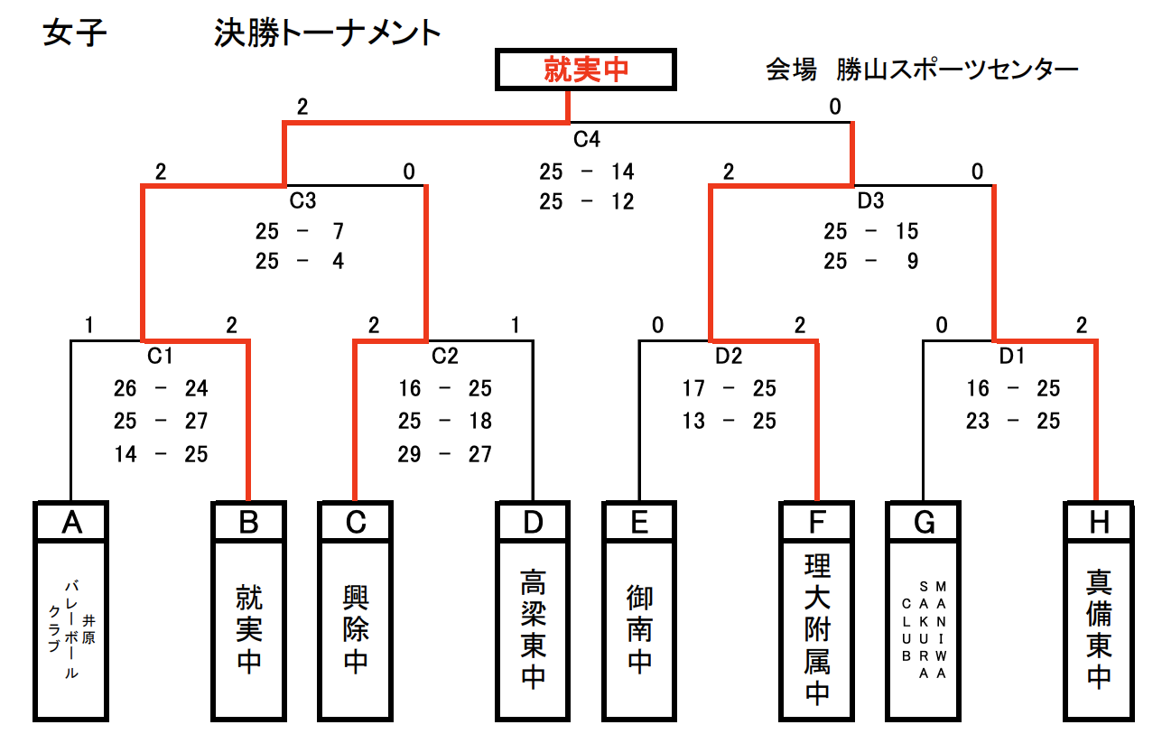 | 就実中 | 2 | 25-14 25-12 | 0 | 理大附属中 |