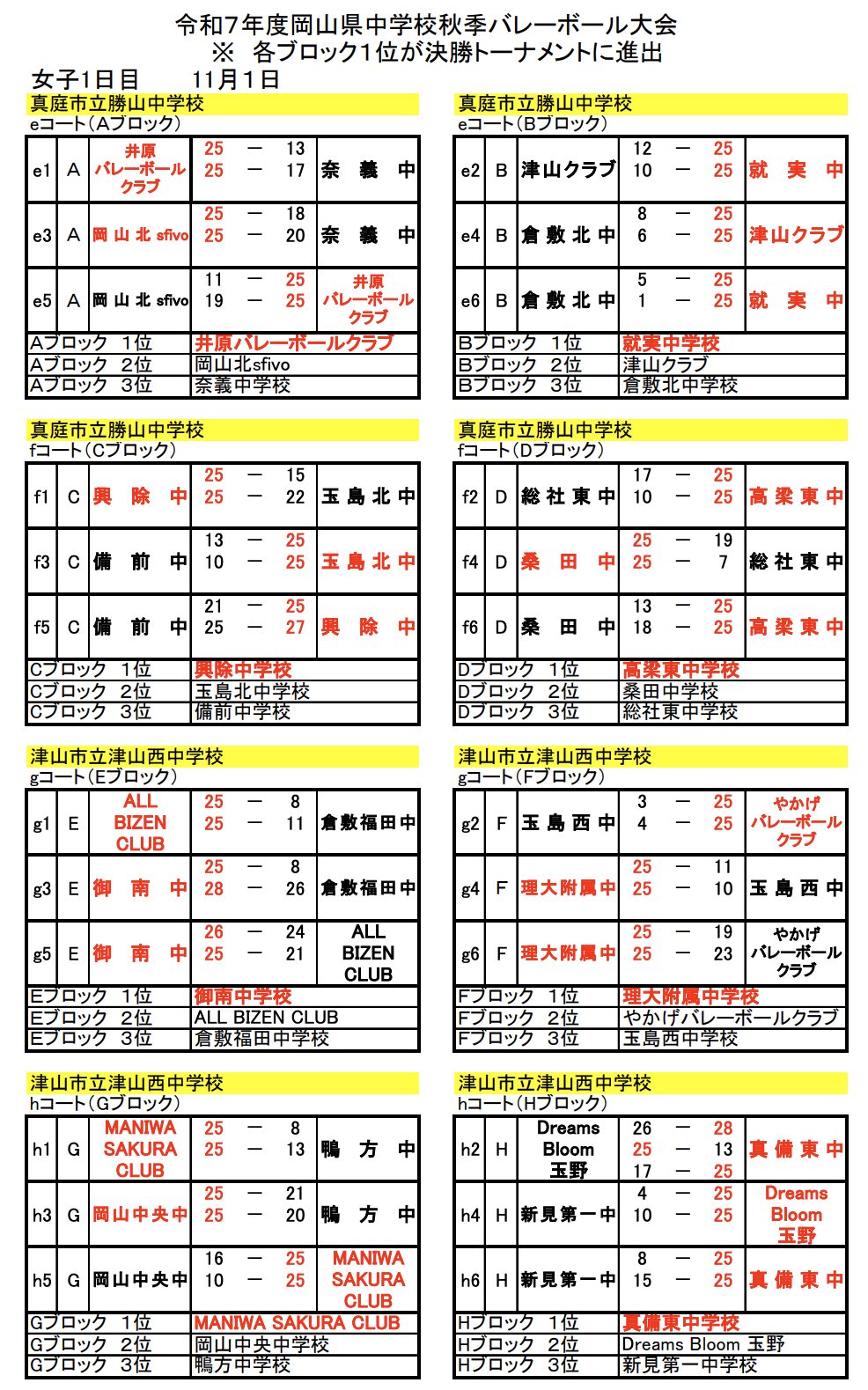 | 就実中 | 2 | 25-7 25-4 | 0 | 興除中 |