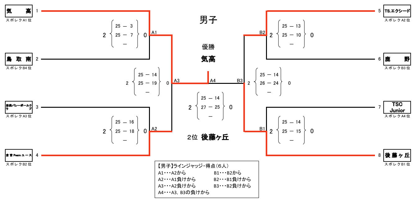 | 気 高 | 2 | 25-14 25-19 | 0 | 倉吉Pearsユース |