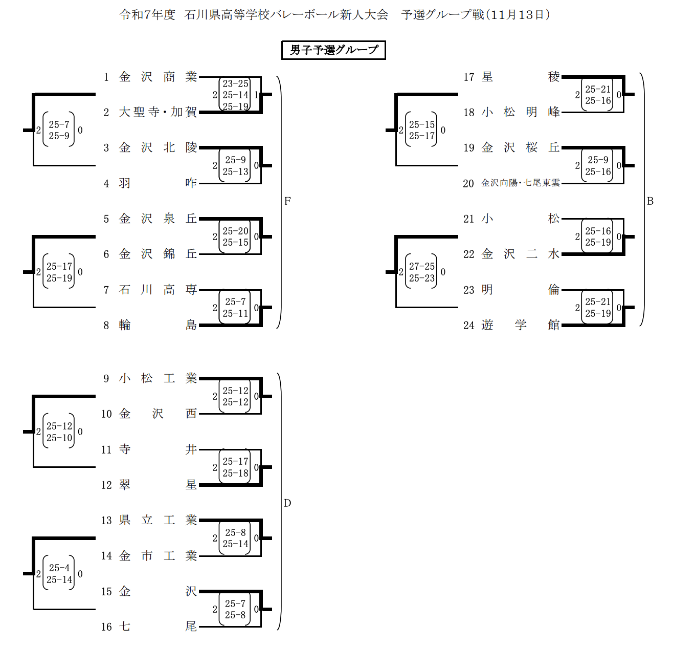| 金沢二水 | 2 | 25-12 25-21 | 0 | 金沢錦丘 |
