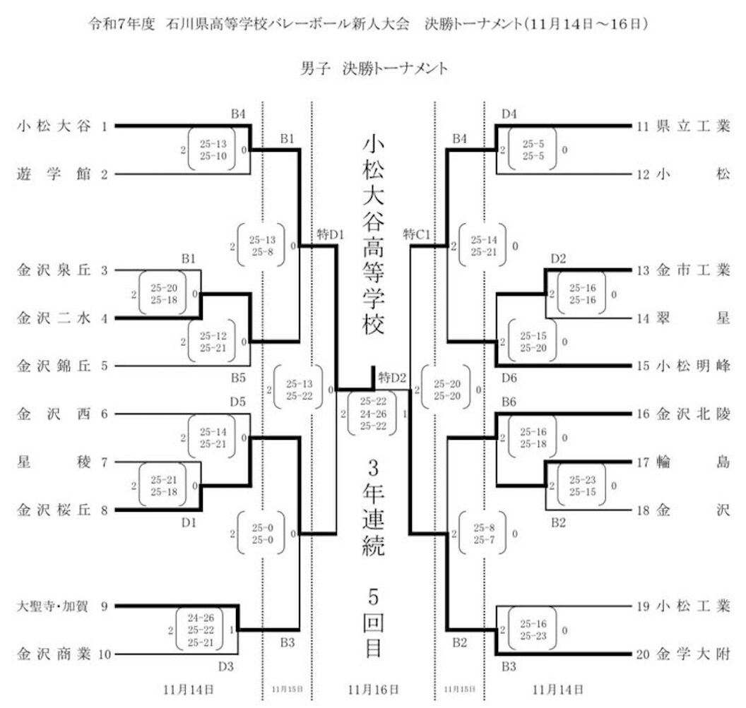 | 小松大谷 | 2 | 25-22 24-26 25-22 | 1 | 金学大附 |