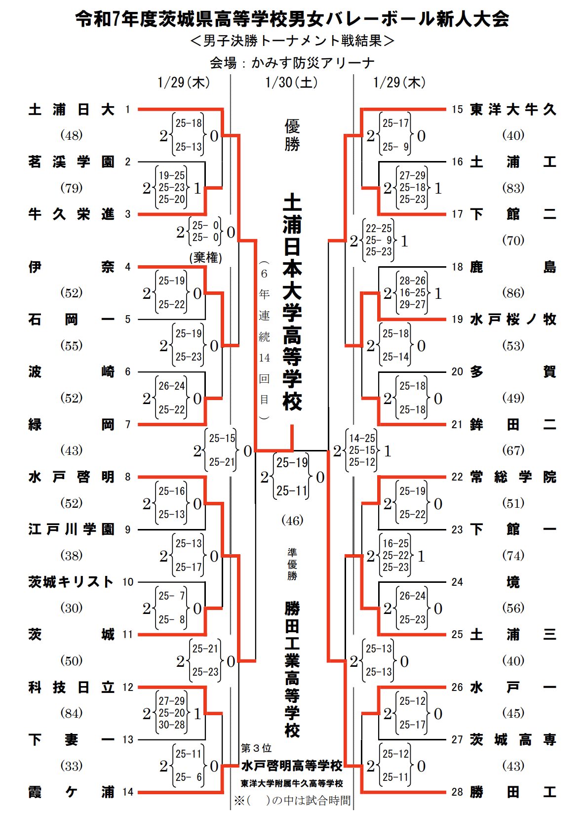 | 水戸啓明 | 2 | 25-21 25-23 | 0 | 霞ケ浦 |