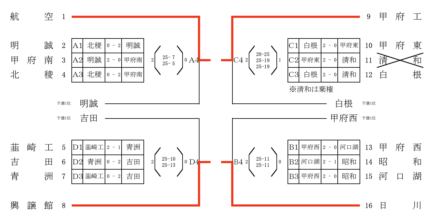 | 興譲館 | 2 | 25-21 25-20 | 0 | 甲府工業 |