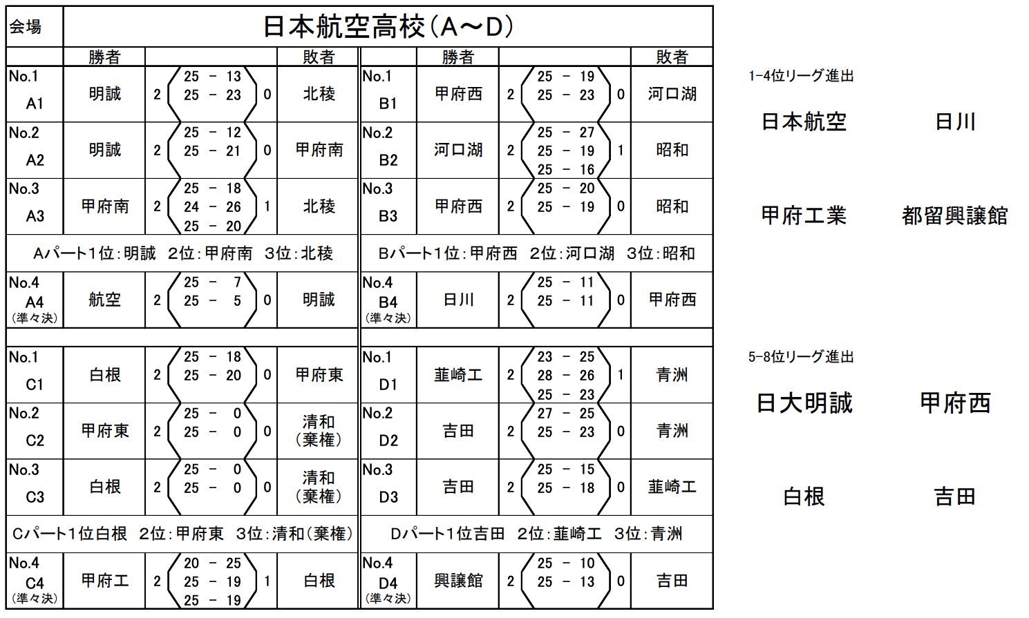 | 日 川 | 2 | 25-13 25-11 | 0 | 甲府工業 |