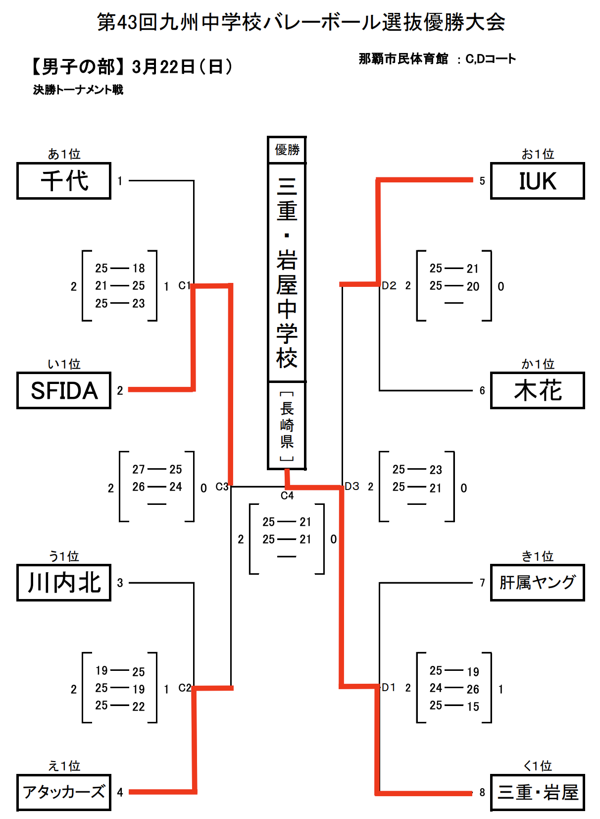 | 三重・岩屋 (長崎県3位) | 2 | 25-11 25-22 | 0 | 名 護 (沖縄県2位) |