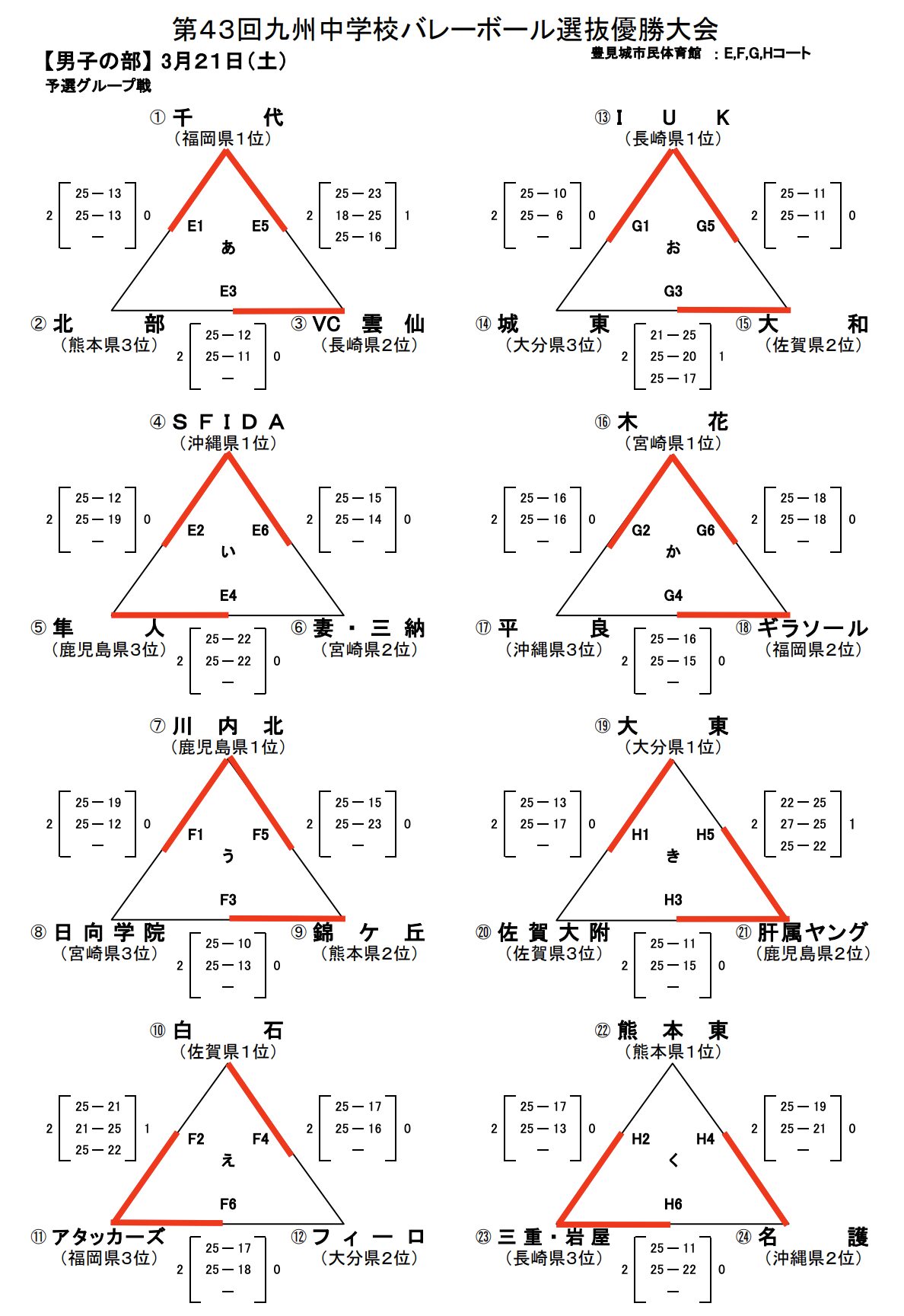 | 千 代 (福岡県1位) | 2 | 25-13 25-13 | 0 | 北 部 (熊本県3位) |