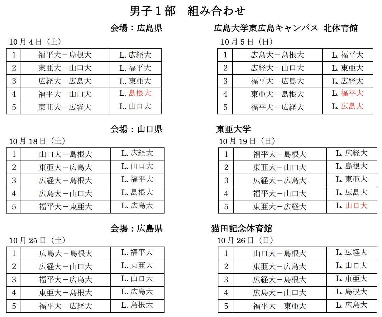 | 山口大学 (山口) | 3 | 25-22 25-21 25-21 | 0 | 島根大学 (島根) |