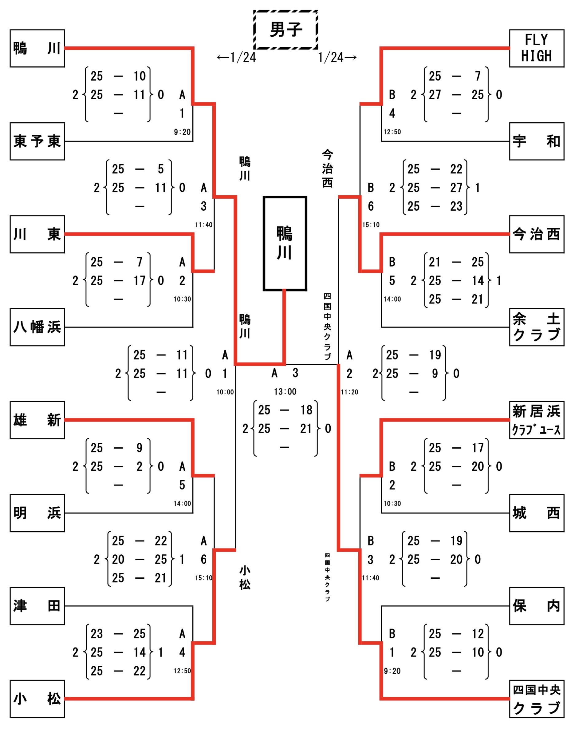 | 鴨 川 | 2 | 25-5 25-11 | 0 | 川 東 |