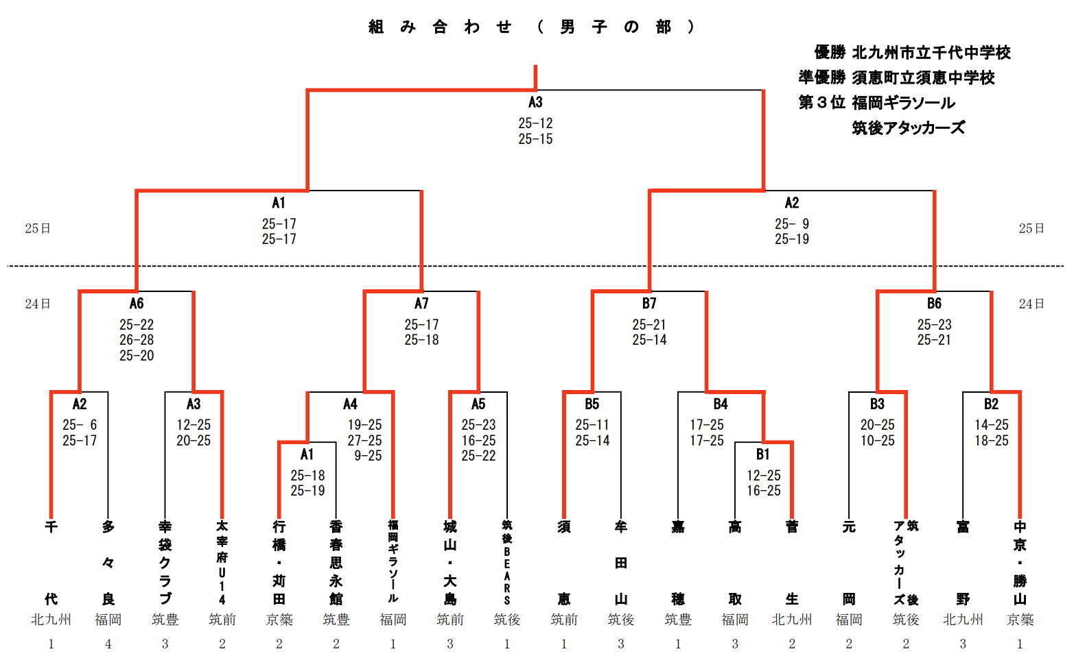 | 千 代 | 2 | 25-22 26-28 25-20 | 0 | 太宰府U14 |