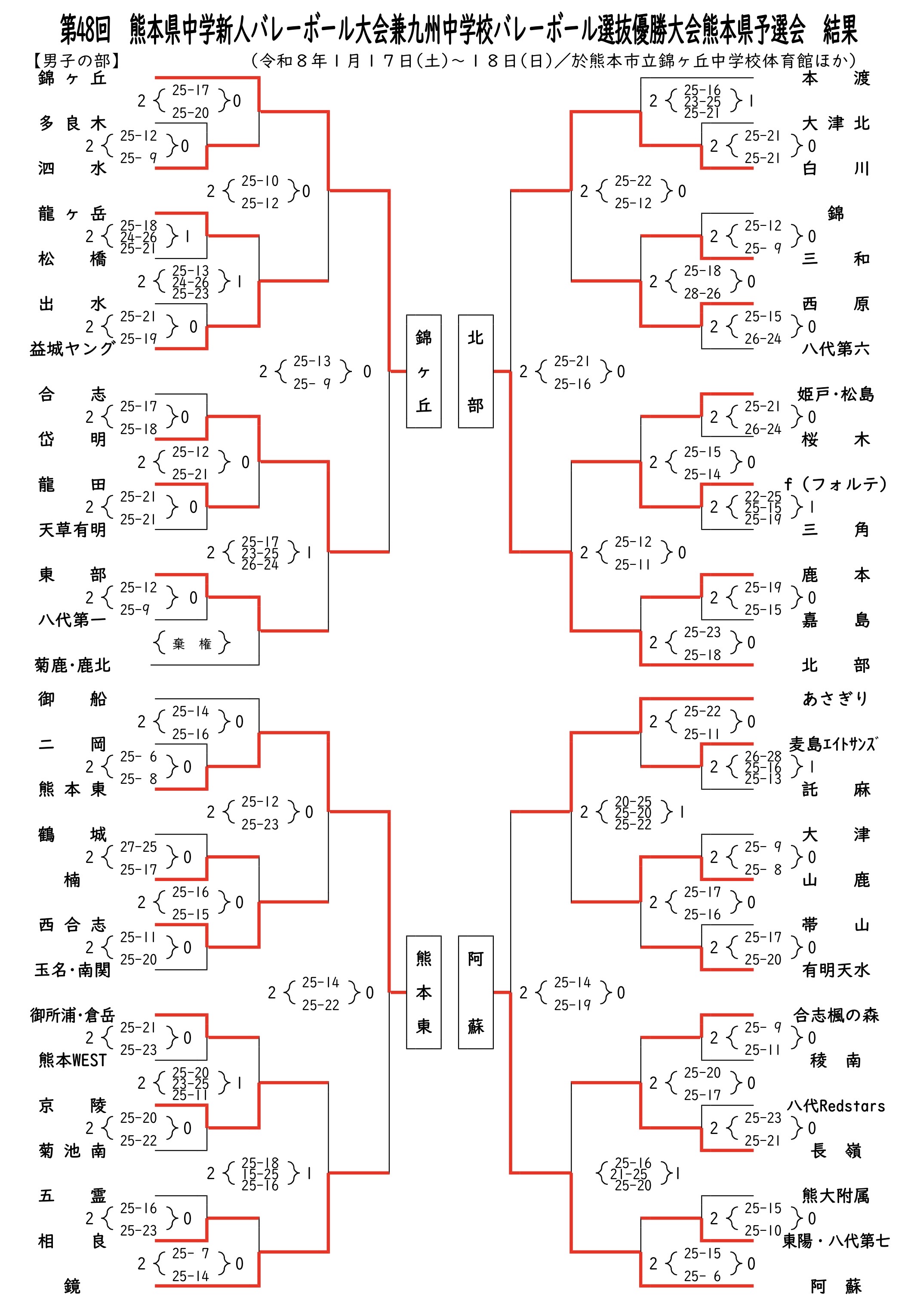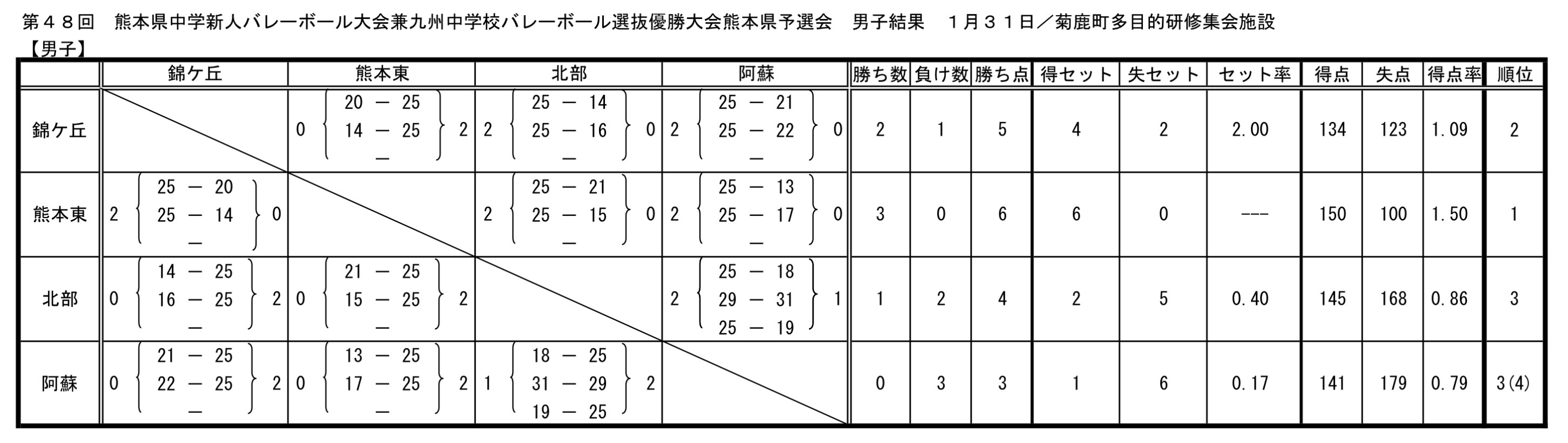 | 錦ヶ丘 | 2 | 25-21 25-22 | 0 | 阿 蘇 |