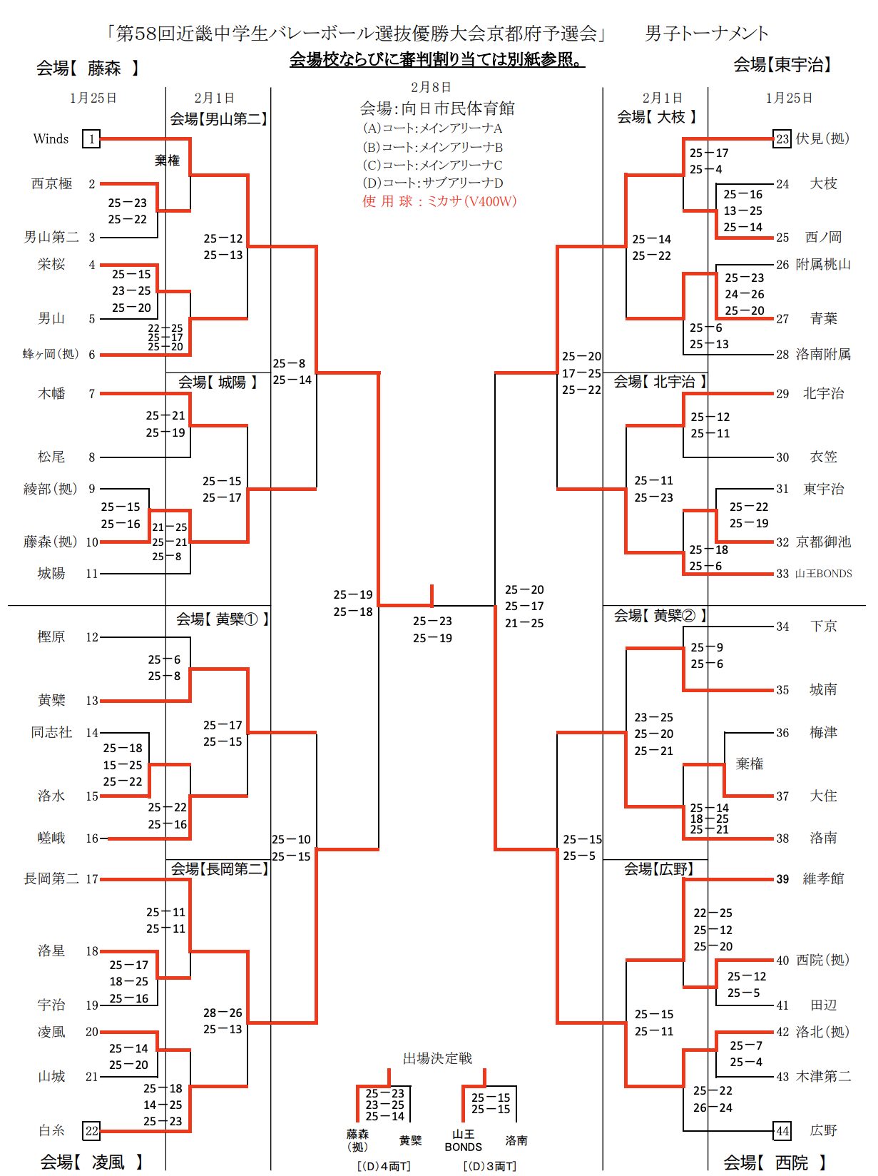 | 伏 見 | 1 | 20₋25 17⁻25 0-0 | 2 | 洛 北 |