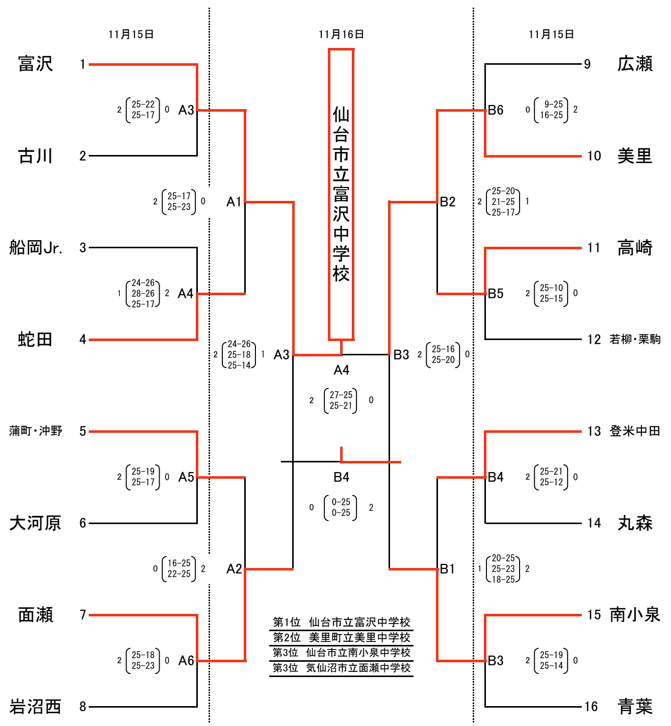 | 富 沢 | 2 | 25-17 25-23 | 0 | 蛇 田 |