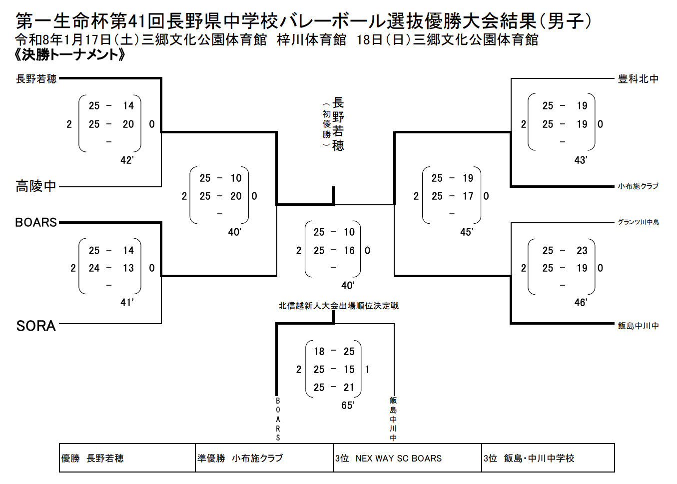 | 長野若穂 | 2 | 25-10 25-20 | 0 | BOARS |