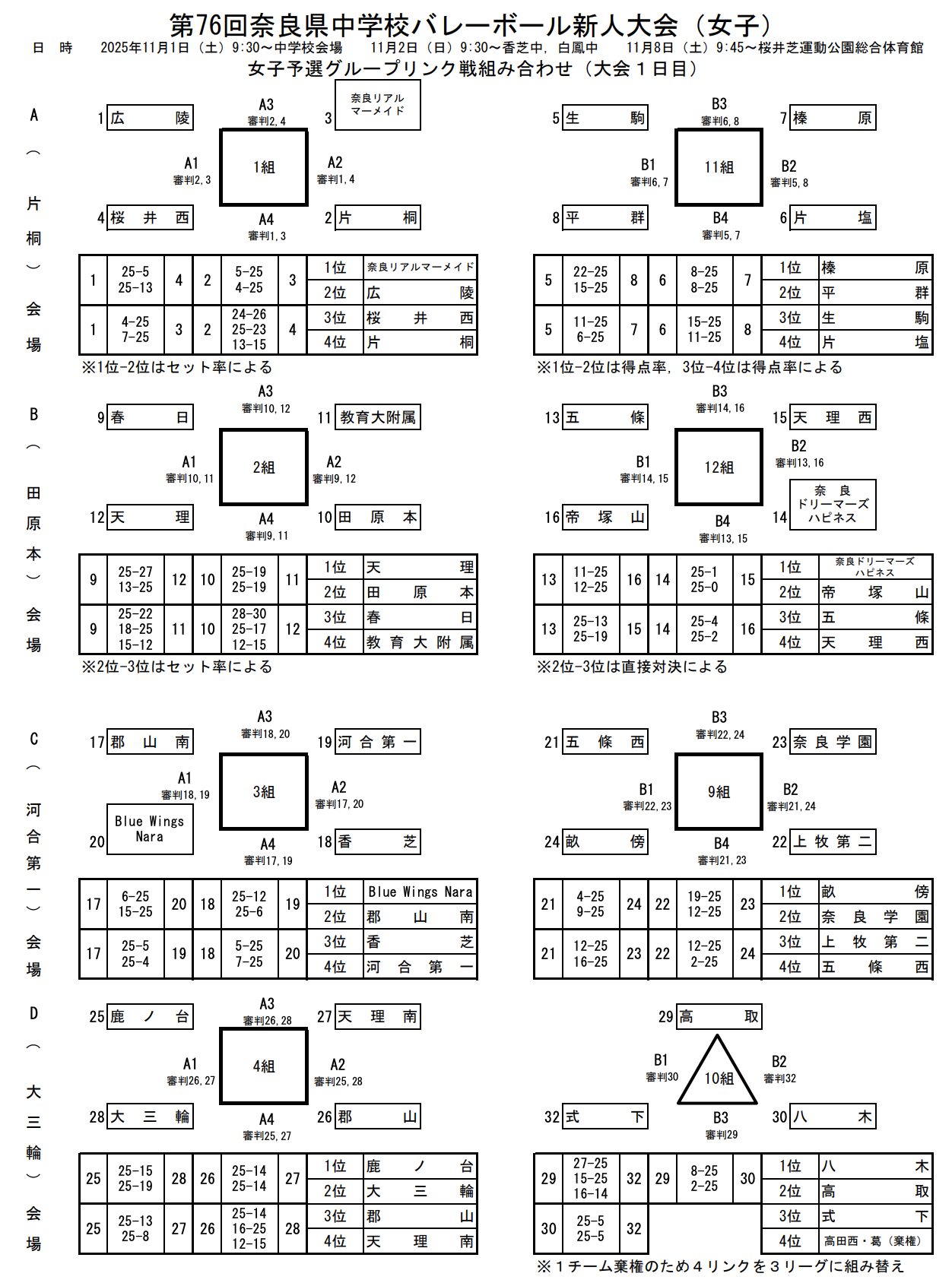 | 郡山西 | 2 | 25-10 25-14 | 0 | 王寺南 |