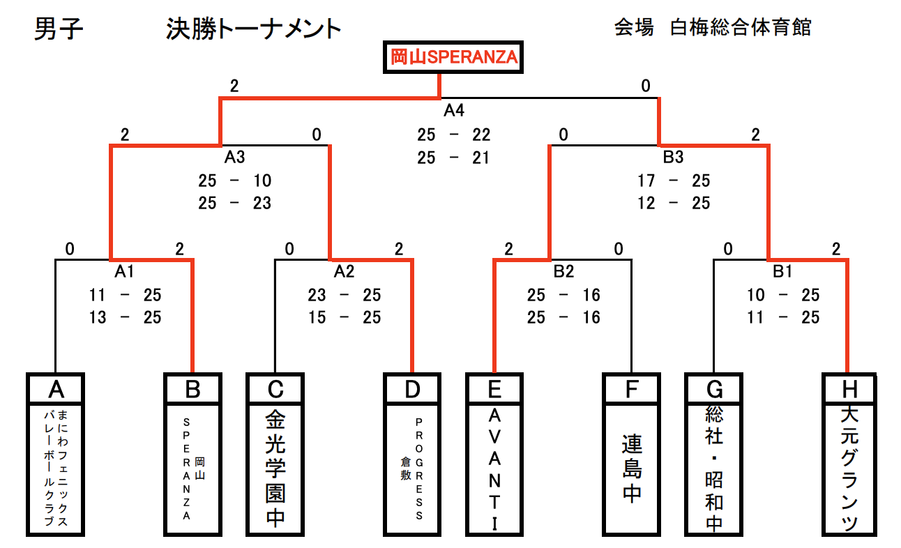 | 金光学園中 | 0 | 23-25 15-25 | 2 | PROGRESS倉敷 |