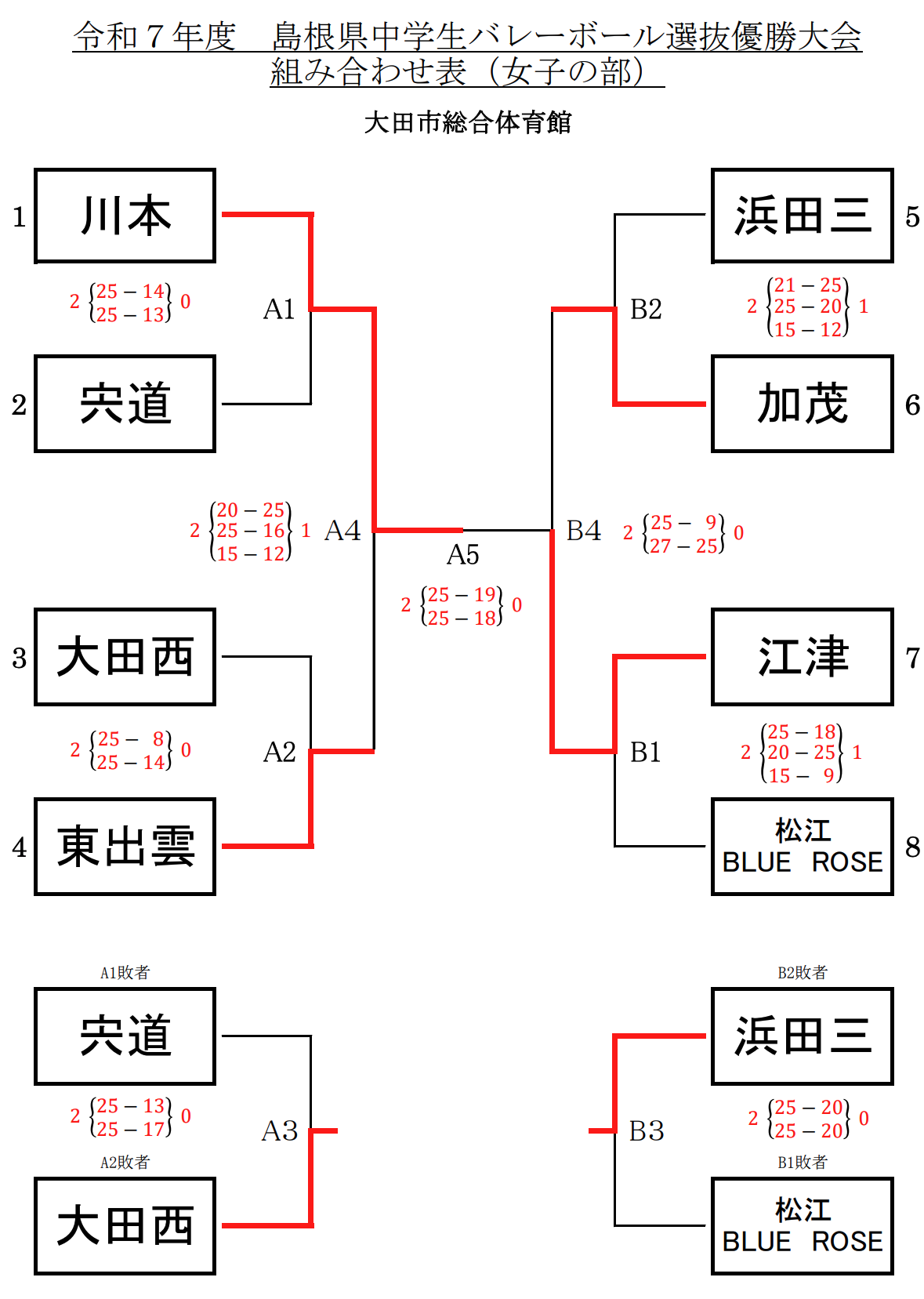 | 川 本 | 2 | 25-19 25-18 | 0 | 江 津 |