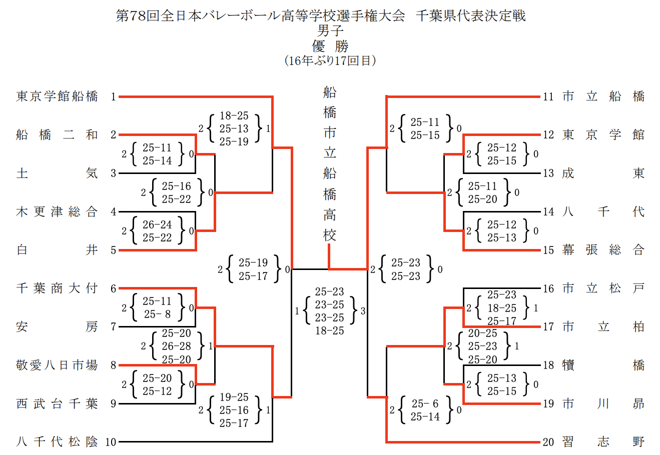 | 東京学館船橋 | 1 | 25-23 23-25 23-25 18-25 | 3 | 市立船橋 |