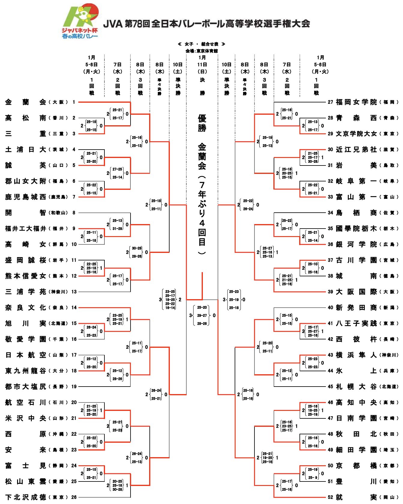 | 奈良文化 (奈良県) | 2 | 23-25 25-19 25-21 | 1 | 旭川実業 (北海道) |