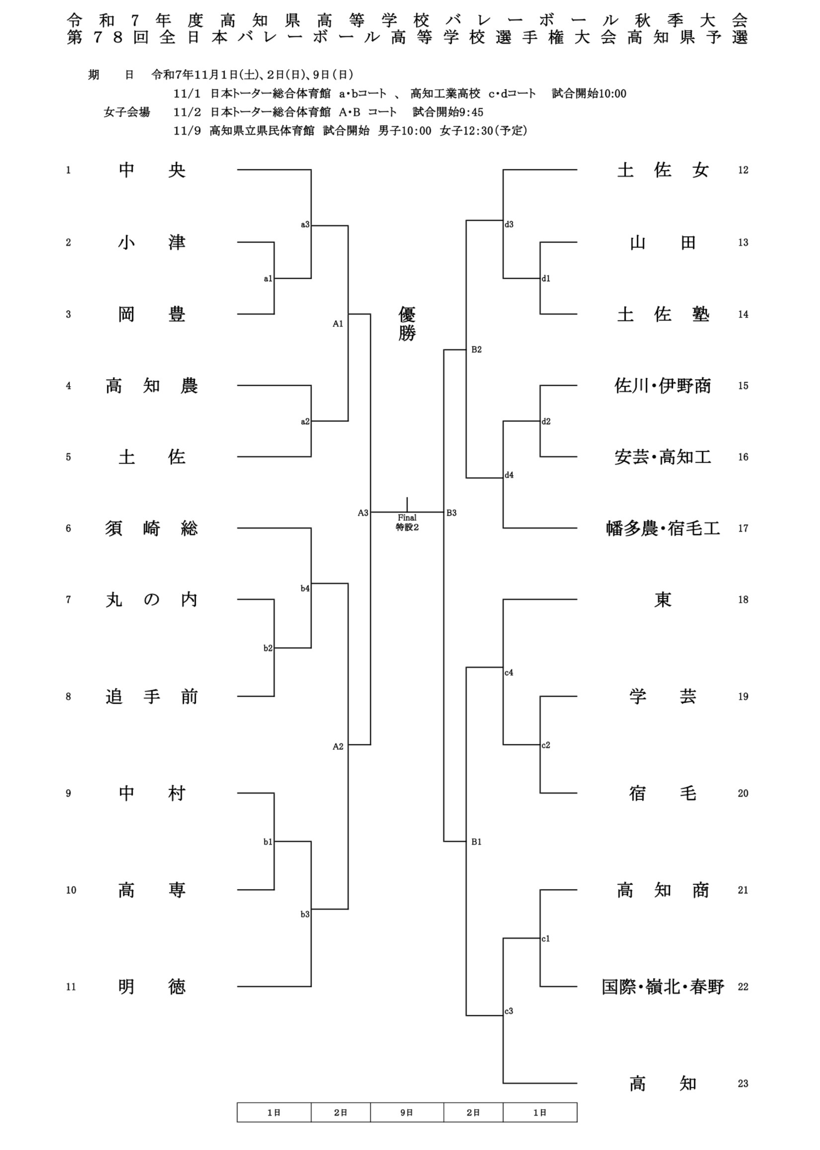 | 須崎総 | 1 | 16-25 28-26 22-25 | 2 | 追手前 |