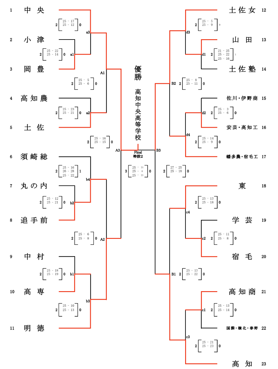 | 高知中央 | 2 | 25-5 25-6 | 0 | 土 佐 |