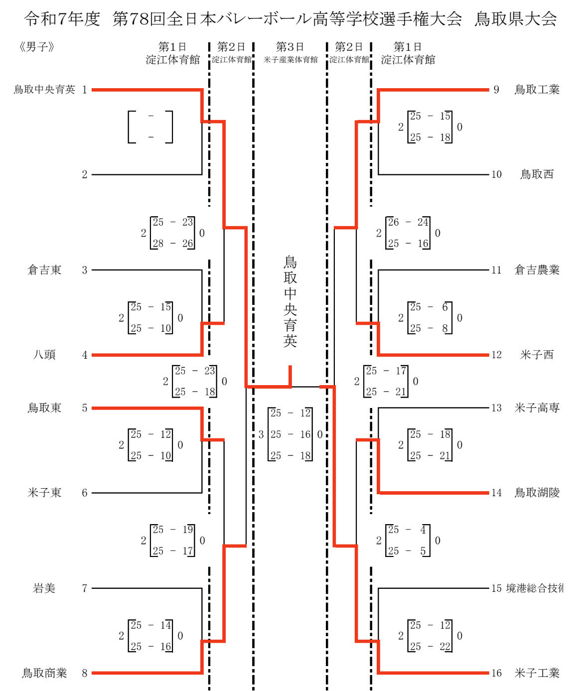 | 鳥取中央育英 | 3 | 25-12 25-16 25-18 | 0 | 米子工業 |