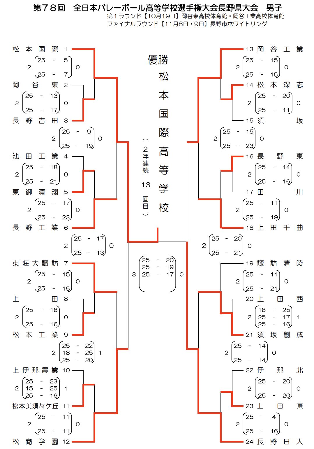 | 松本深志 | 2 | 25-20 25-11 | 0 | 須 坂 |