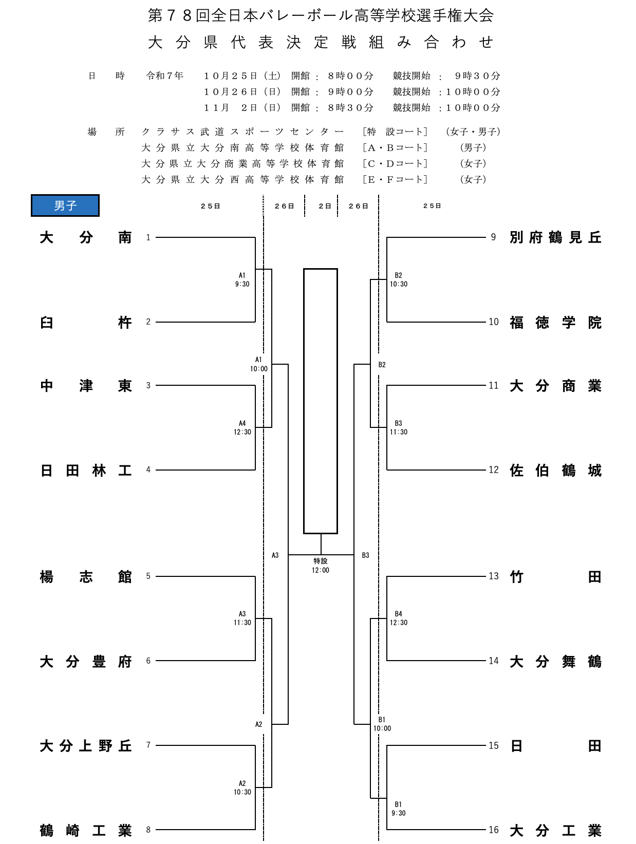 大分県の男子の有力はやはり、大分南高校、大分工業高校、鶴崎工業高校、別府鶴見丘高校が中心になるのでしょうね!