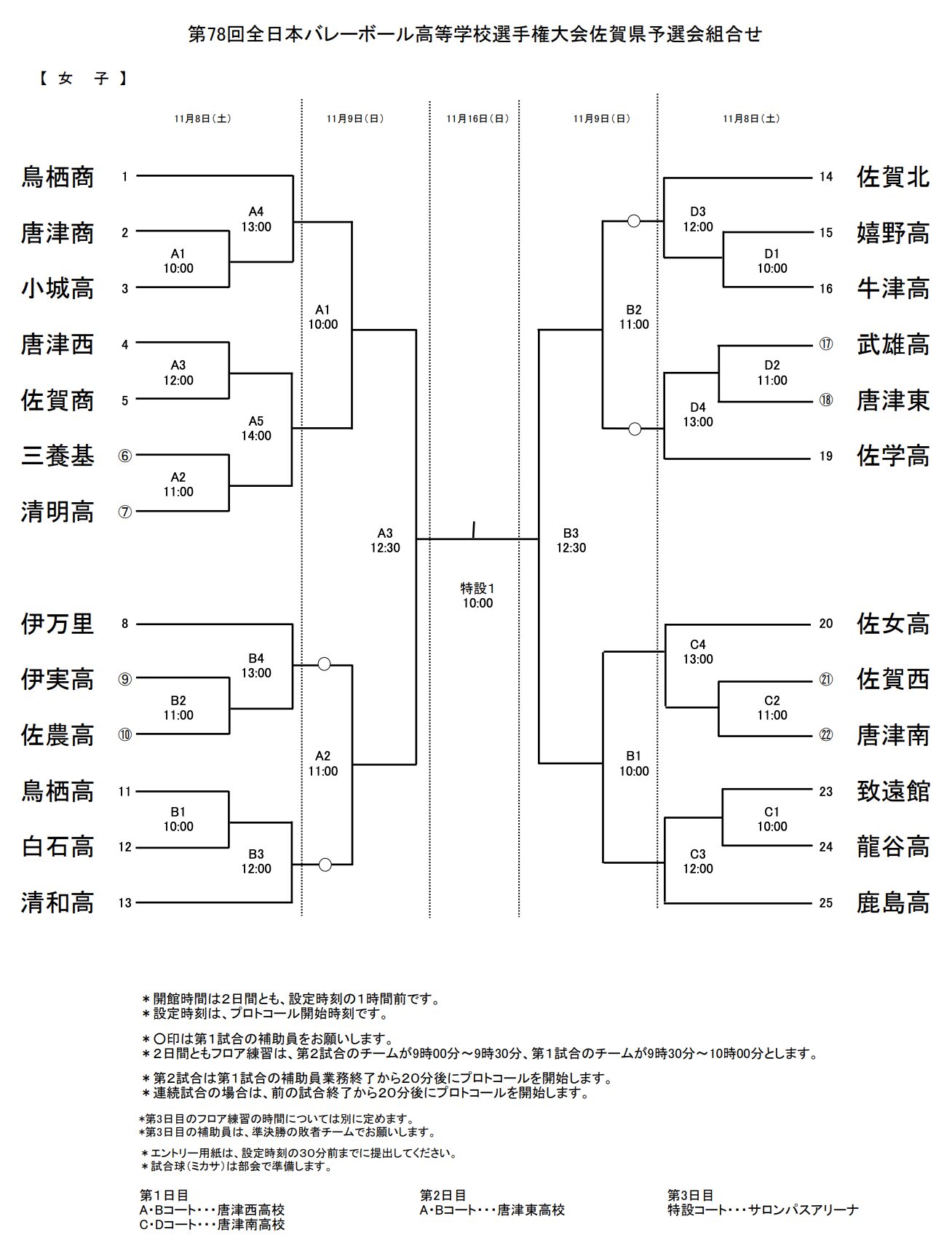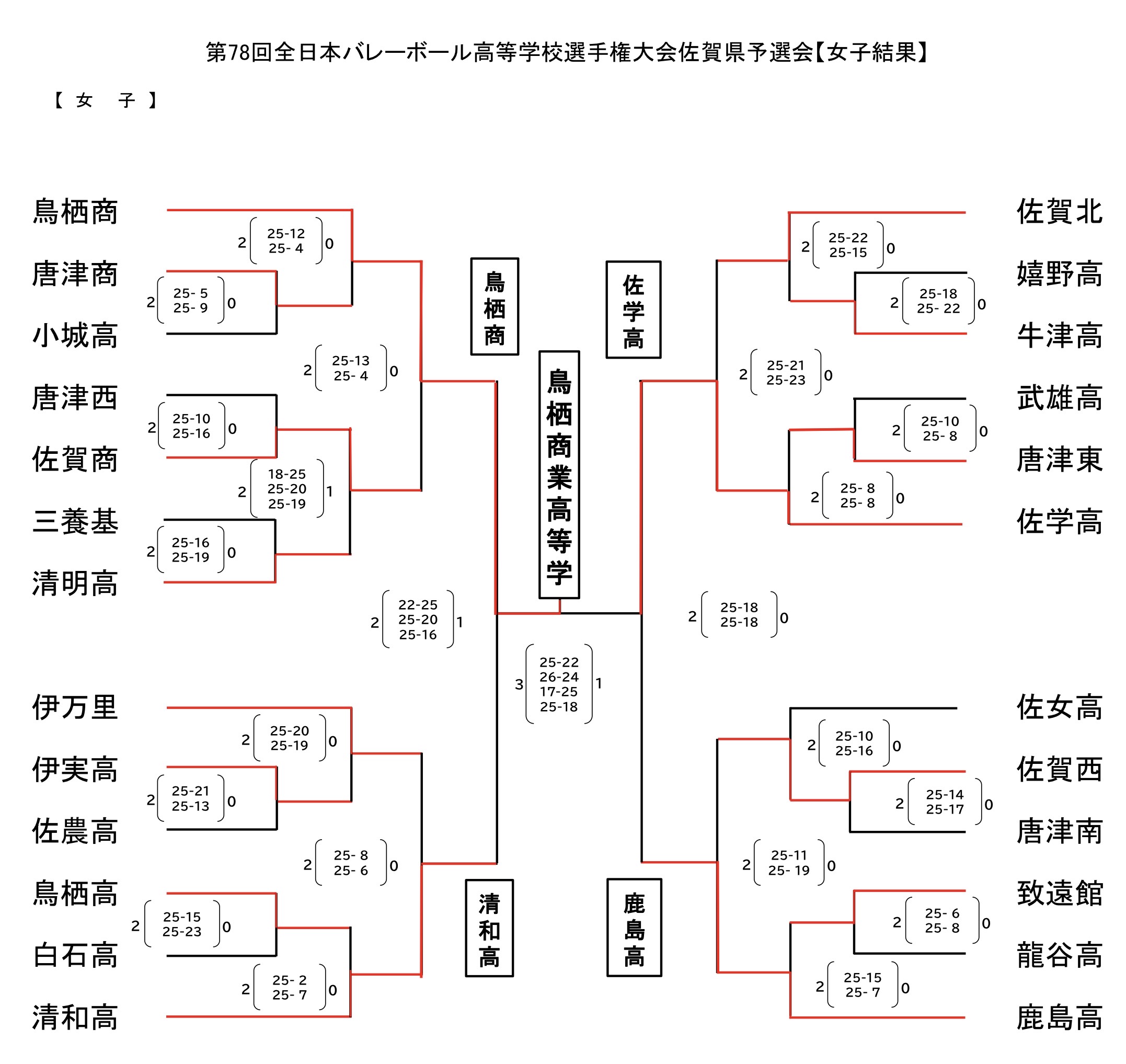 | 鳥栖商業 | 0 | 25-13 25-4 | 0 | 佐賀商業 |