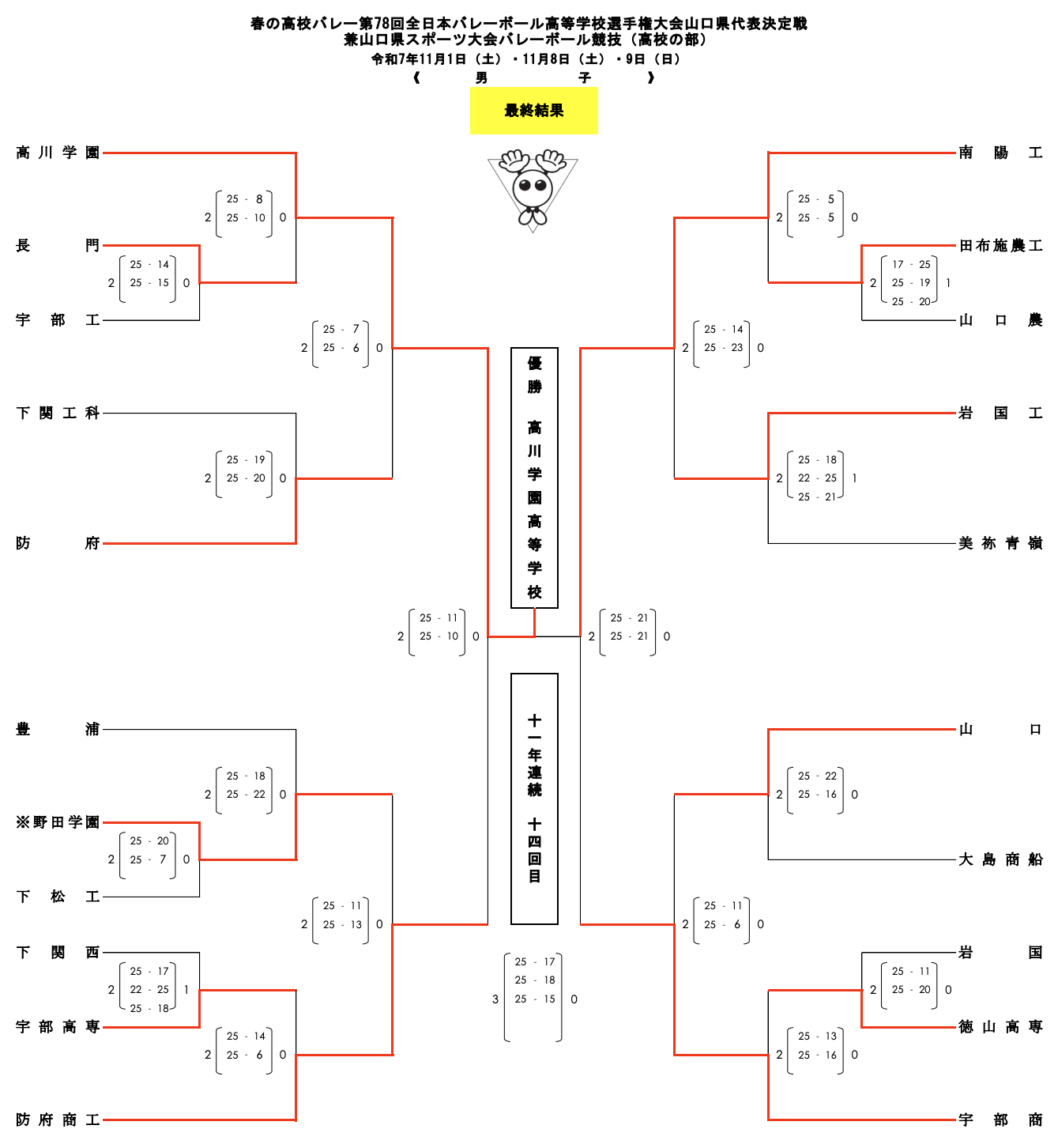| 高川学園 | 3 | 25-17 25-18 25-15 | 0 | 宇部商業 |