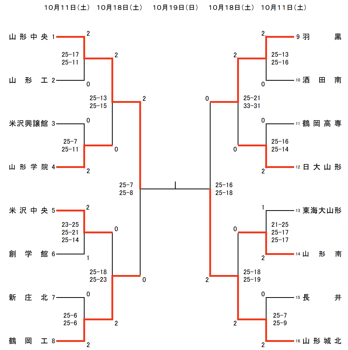 | 山形中央 | 2 | 25-7 25-8 | 0 | 鶴岡工業 |