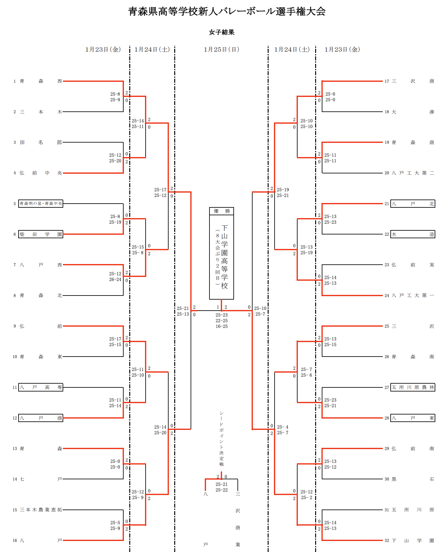 | 青森西 | 1 | 25-23 22-25 16-25 | 2 | 下山学園 |