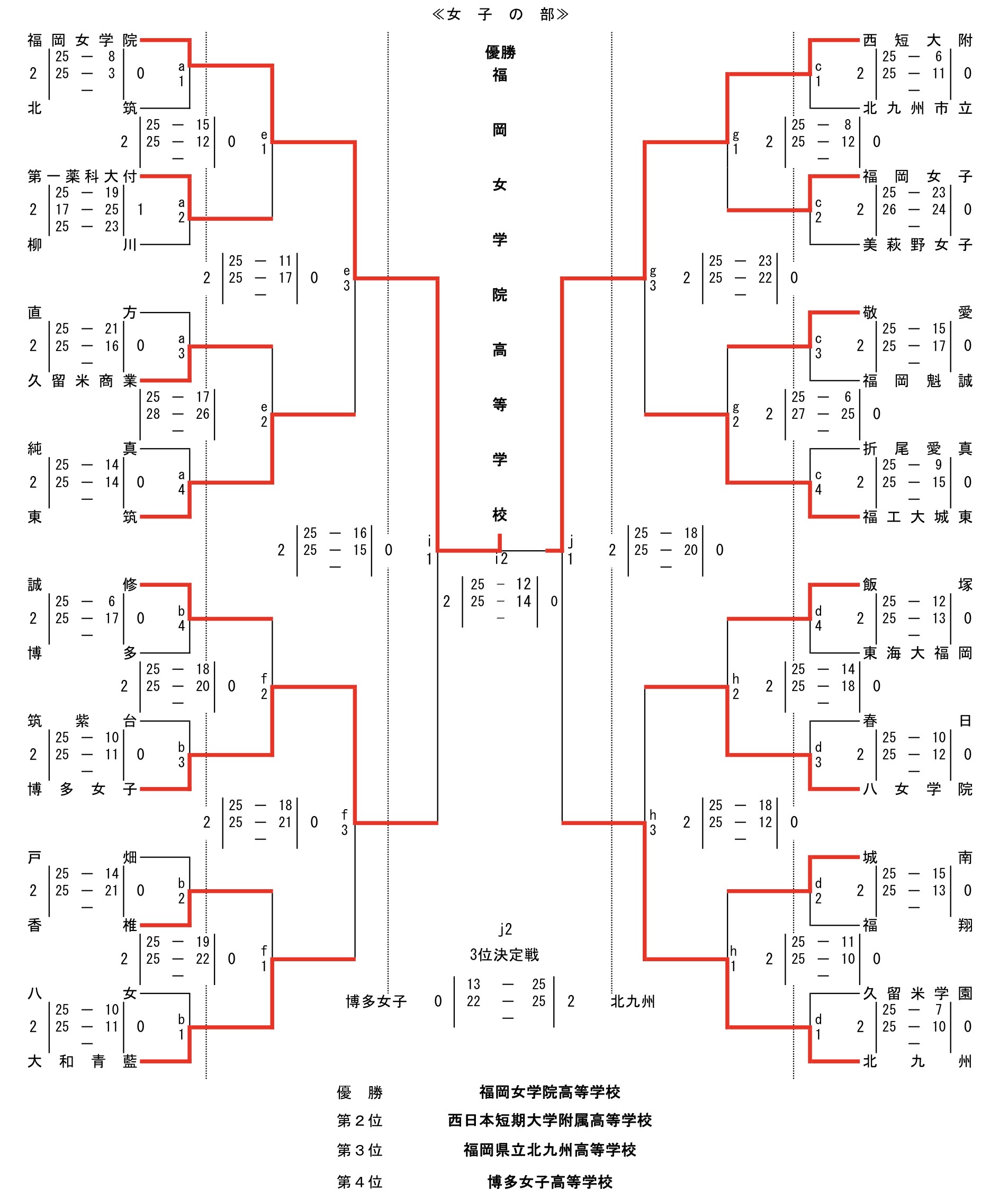 | 福岡女学院 | 2 | 25-16 25-15 | 0 | 博多女子 |