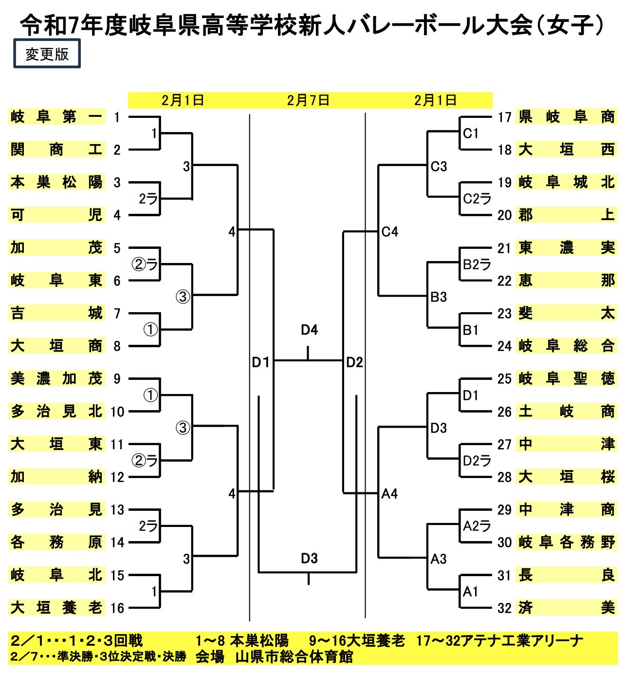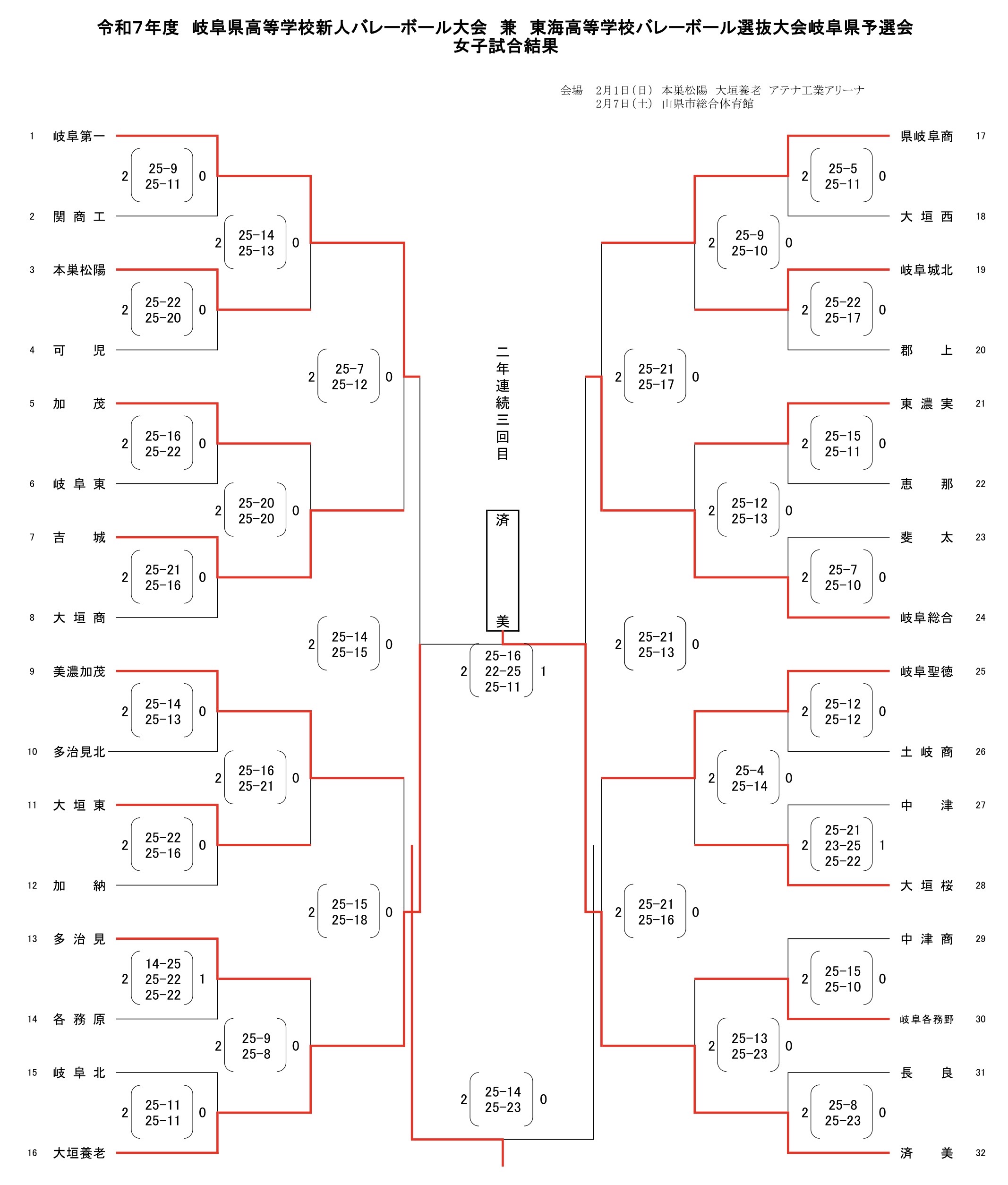 | 岐阜第一 | 2 | 25-14 25-23 | 0 | 岐阜総合 |