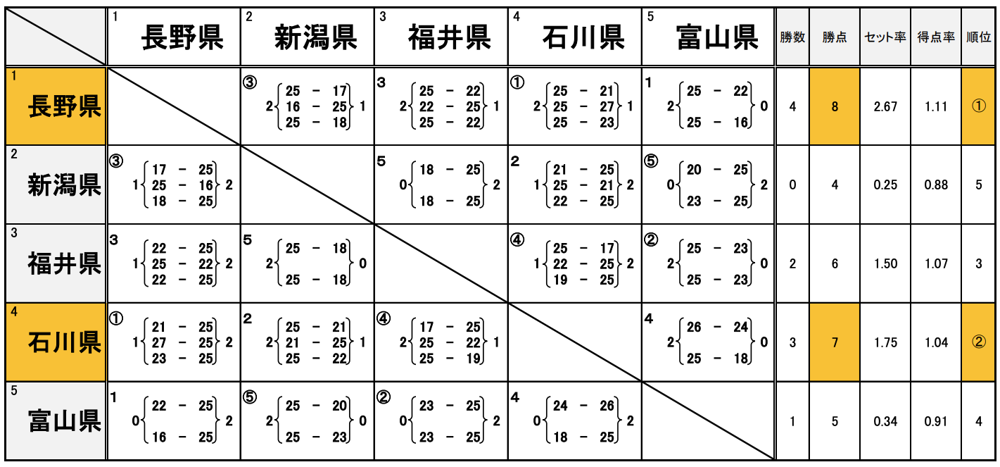 | 福井県 | 1 | 25-17 22-25 19-25 | 2 | 石川県 |