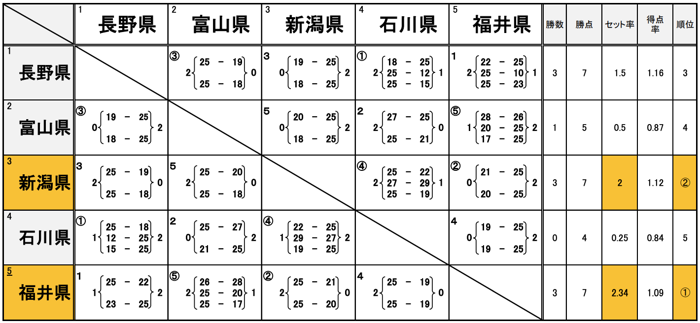 | 新潟県 | 2 | 25-22 27-29 25-19 | 1 | 石川県 |