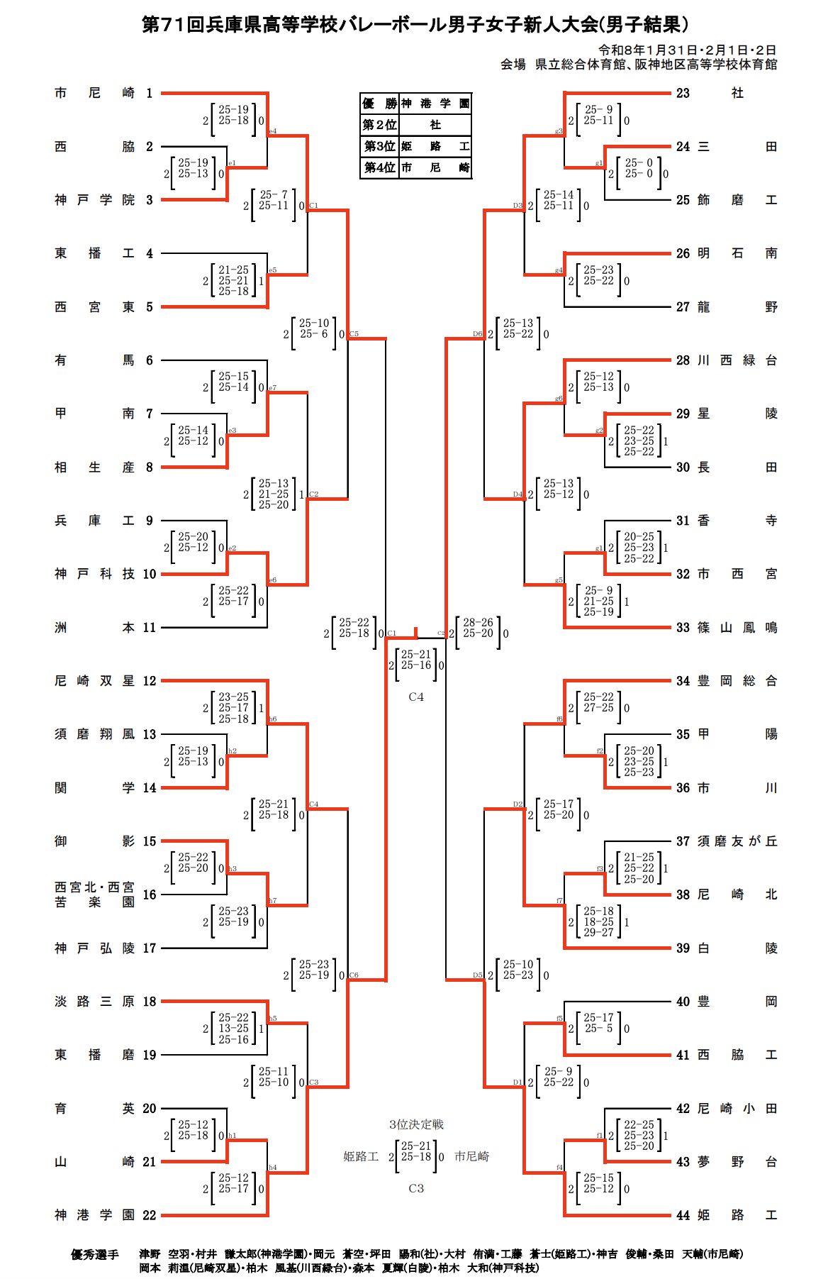 | 須磨友が丘 | 1 | 25-21 22-25 20-25 | 2 | 尼崎北 |