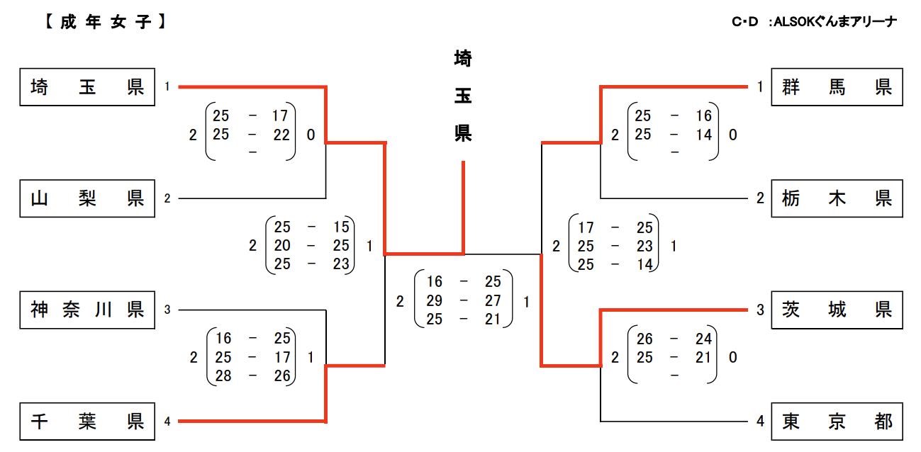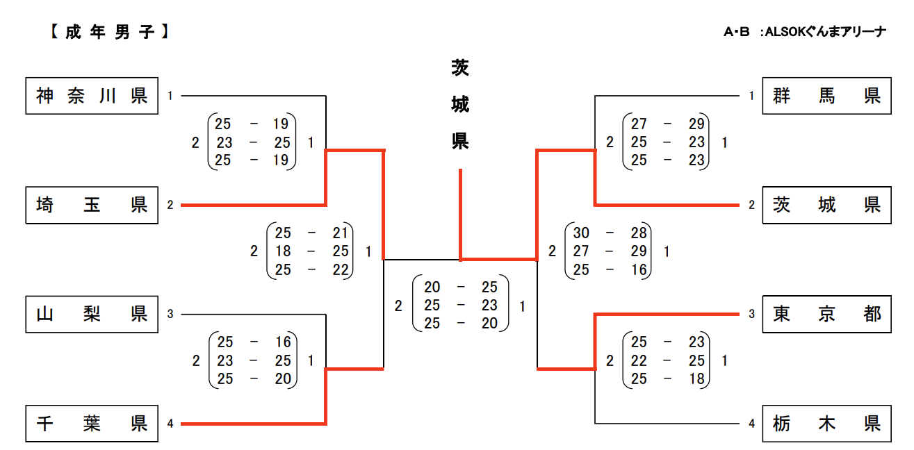 | 埼玉県 | 1 | 25-20 23-25 20-25 | 2 | 茨城県 |